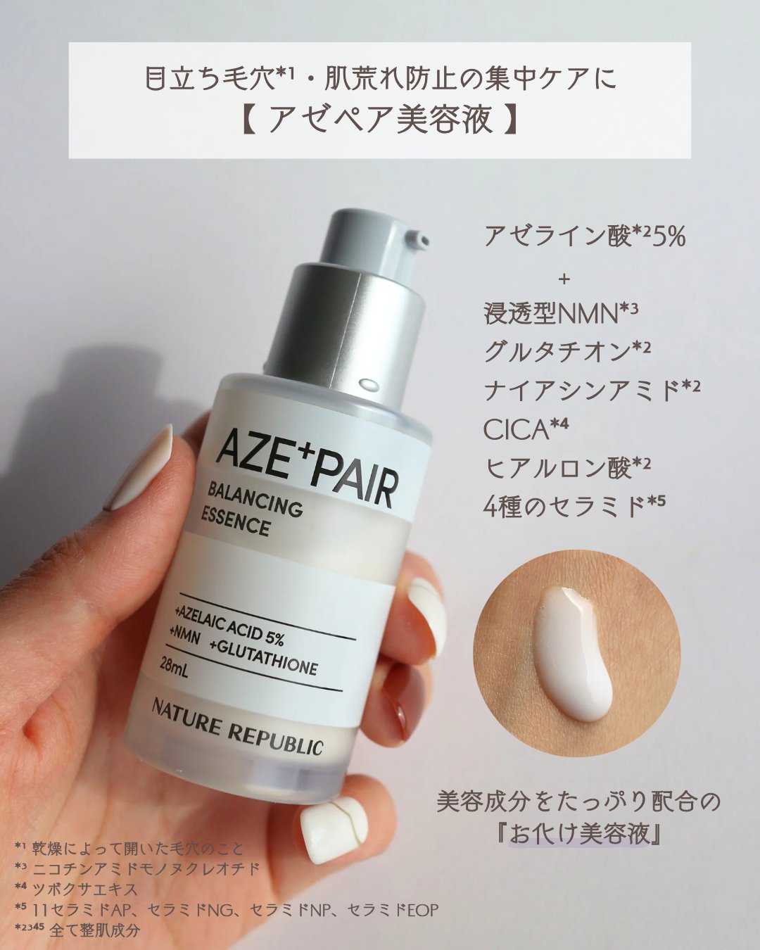- 【韓国の肌管理*から発想を得たアゼペア】 高濃度*1の純アゼライン酸*2と厳選した美容成分が皮脂トラブル*3や肌荒れをしっかり防ぎながらも毛穴*4をケアして透明感*5のある肌へと整えます。 美容液には純アゼライン酸*2を5%配合しており、ミルクタイプのエッセンスが濃密なうるおいを素肌に届けます。普段のスキンケアにプラスするだけで皮脂トラブル*3をケアし、肌荒れを防ぎます。 先行発売:2024年8月31日よりロフト、PLAZA・MINiPLA、公式オンラインストアにて先行発売。 *うるおいケアのこと*1当社比*2保湿成分*3過剰な皮脂の分泌による肌荒れのこと*4乾燥によって開いた毛穴のこと*5うるおいを与えることによる肌印象のこと