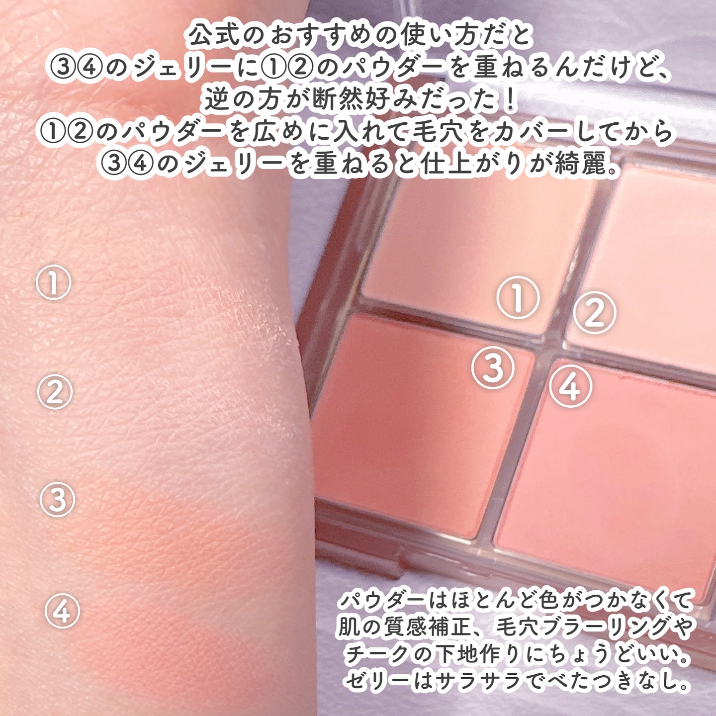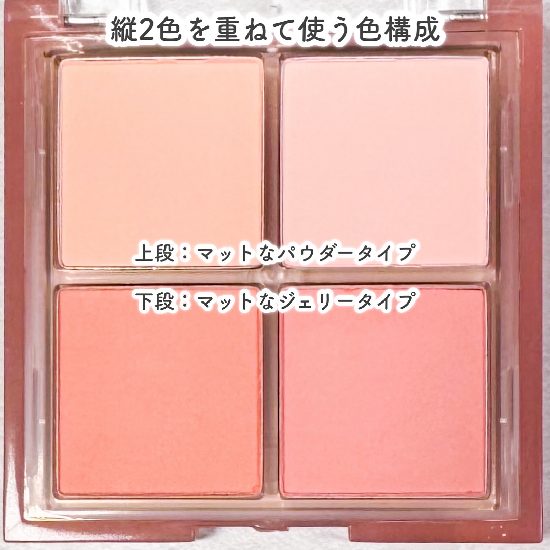 重ね塗りすることで完成する新感覚チーク🌷 上段はプレスドテクスチャー、下段はゼリーチーク。 ゼリーチークはふんわりマットのような仕上がり、ベースを作ったあとに上からプレスドチークを重ね塗り❤️ イエベ、ブルベそれぞれ使いやすいカラーが詰まっていて組み合わせ次第でアレンジし放題😍✨