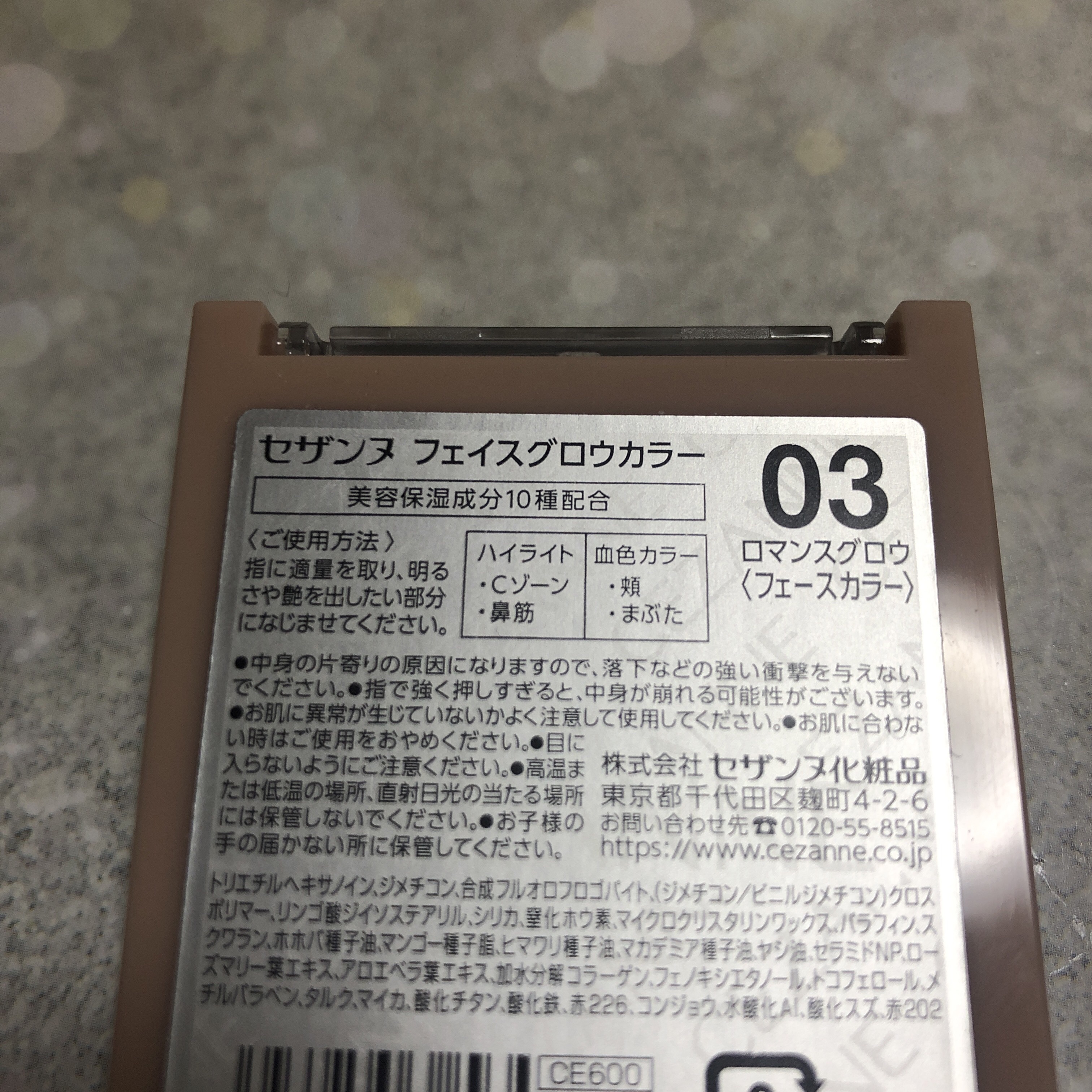 - <01 アプリコットグロウ> トリエチルヘキサノイン、ジメチコン、合成フルオロフロゴパイト、(ジメチコン/ビニルジメチコン)クロスポリマー、リンゴ酸ジイソステアリル、シリカ、窒化ホウ素、マイクロクリスタリンワックス、パラフィン、スクワラン、ホホバ種子油、マンゴー種子脂、ヒマワリ種子油、マカデミア種子油、ヤシ油、セラミドNP、ローズマリー葉エキス、アロエベラ葉エキス、加水分解コラーゲン、フェノキシエタノール、トコフェロール、メチルパラベン、タルク、マイカ、酸化チタン、酸化鉄、赤226、コンジョウ、水酸化Al、酸化スズ <02 ローズグロウ> トリエチルヘキサノイン、ジメチコン、合成フルオロフロゴパイト、(ジメチコン/ビニルジメチコン)クロスポリマー、リンゴ酸ジイソステアリル、シリカ、窒化ホウ素、マイクロクリスタリンワックス、パラフィン、スクワラン、ホホバ種子油、マンゴー種子脂、ヒマワリ種子油、マカデミア種子油、ヤシ油、セラミドNP、ローズマリー葉エキス、アロエベラ葉エキス、加水分解コラーゲン、フェノキシエタノール、トコフェロール、メチルパラベン、タルク、マイカ、酸化チタン、酸化鉄、赤226、コンジョウ、水酸化Al、酸化スズ、赤202 <03 ロマンスグロウ> トリエチルヘキサノイン、ジメチコン、合成フルオロフロゴパイト、(ジメチコン/ビニルジメチコン)クロスポリマー、リンゴ酸ジイソステアリル、シリカ、窒化ホウ素、マイクロクリスタリンワックス、パラフィン、スクワラン、ホホバ種子油、マンゴー種子脂、ヒマワリ種子油、マカデミア種子油、ヤシ油、セラミドNP、ローズマリー葉エキス、アロエベラ葉エキス、加水分解コラーゲン、フェノキシエタノール、トコフェロール、メチルパラベン、タルク、マイカ、酸化チタン、酸化鉄、赤226、コンジョウ、水酸化Al、酸化スズ、赤202 <SP1 ヨザクラグロウ> トリエチルヘキサノイン、ジメチコン、合成フルオロフロゴパイト、(ジメチコン/ビニルジメチコン)クロスポリマー、リンゴ酸ジイソステアリル、シリカ、窒化ホウ素、マイクロクリスタリンワックス、パラフィン、スクワラン、ホホバ種子油、マンゴー種子脂、ヒマワリ種子油、マカデミア種子油、ヤシ油、セラミドNP、ローズマリー葉エキス、アロエベラ葉エキス、加水分解コラーゲン、フェノキシエタノール、トコフェロール、メチルパラベン、タルク、マイカ、酸化チタン、酸化鉄、赤226、赤202、コンジョウ、グンジョウ、水酸化Al、酸化スズ
