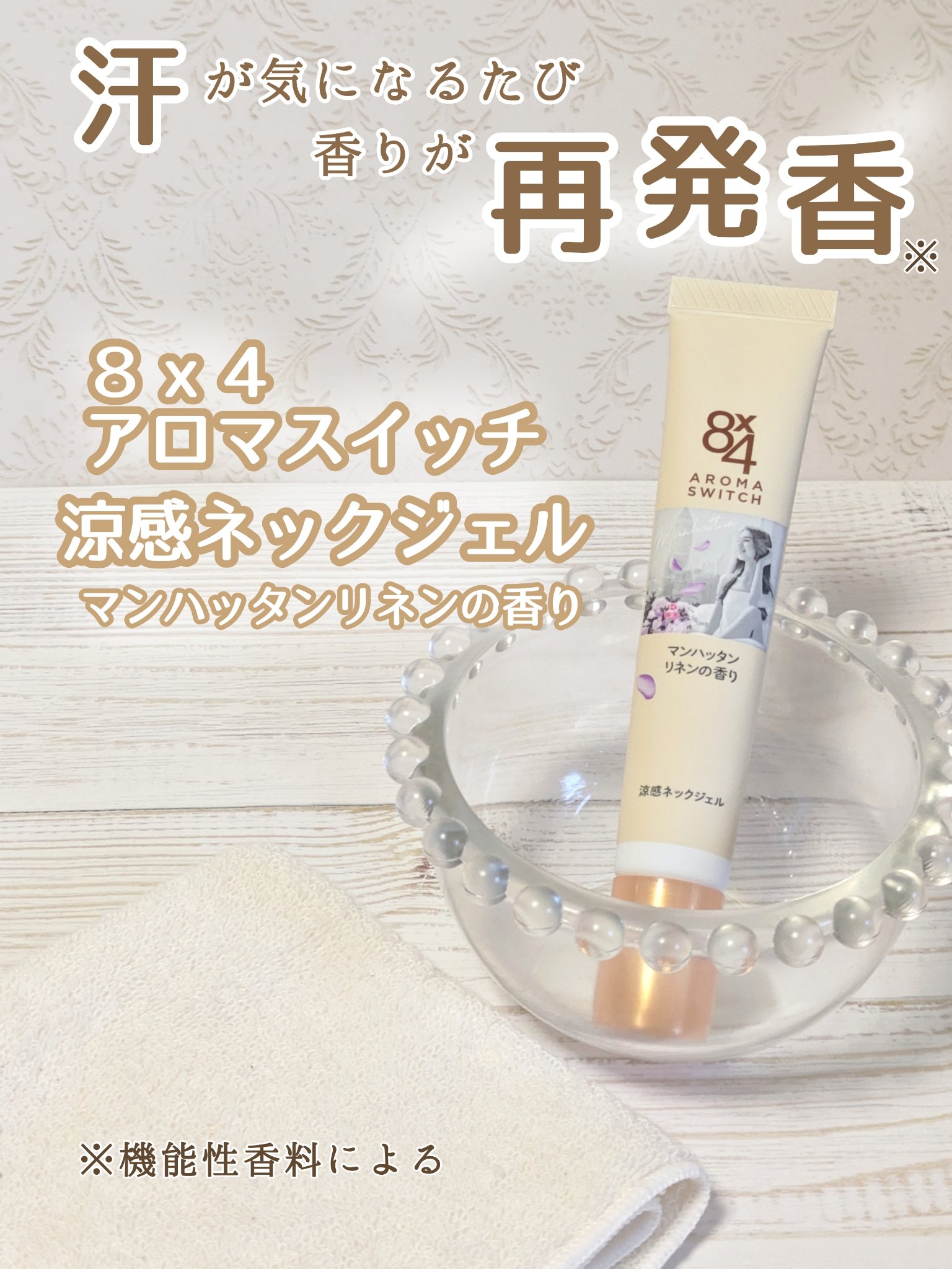 8x4 アロマスイッチ 涼感ネックジェルをお試ししています【商品について】商品名:8x4 アロマスイッチ 涼感ネックジェル マンハッタンリネンの香り価格:オープン価格分量:20g首のベタつきを抑え、髪の張り付きを防ぎます汗が気になるたび、新鮮...