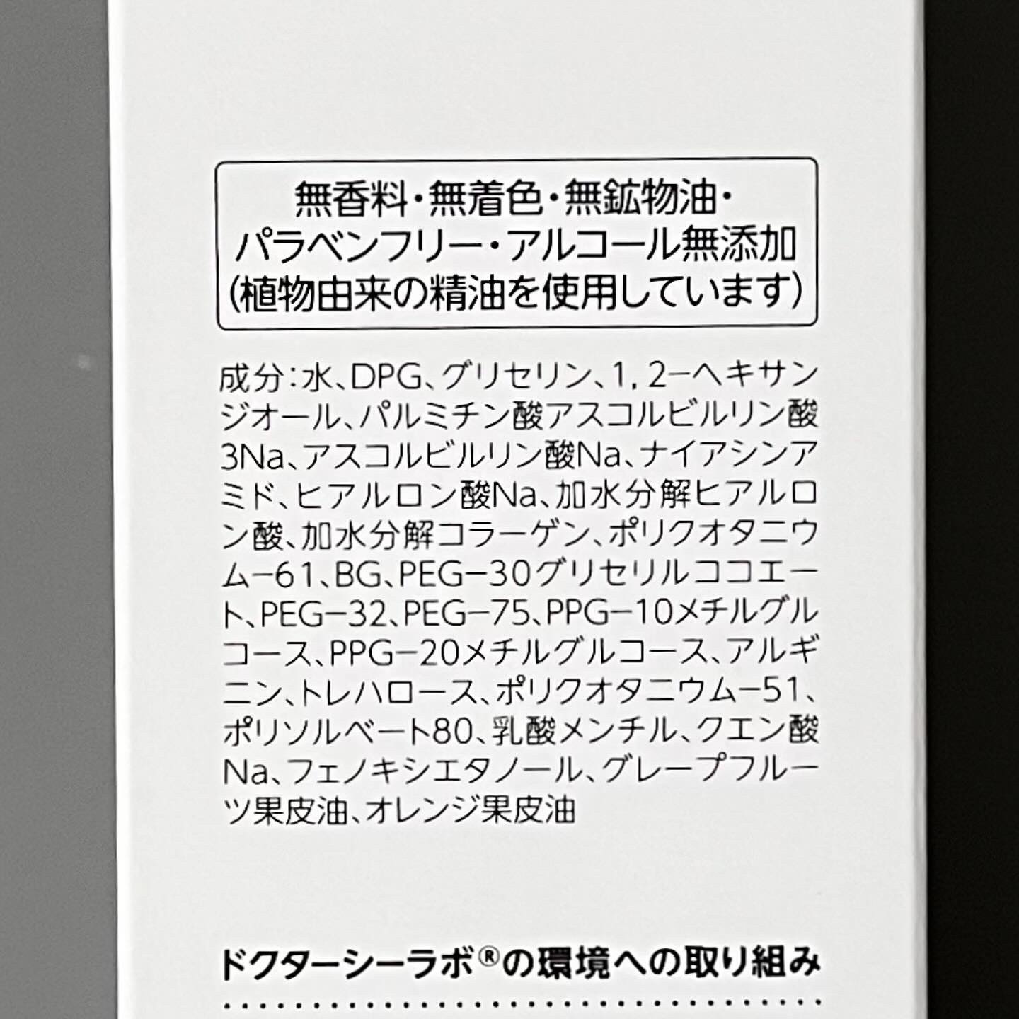 - <150ml> 水、DPG、グリセリン、1,2-ヘキサンジオール、パルミチン酸アスコルビルリン酸3Na、3-O-エチルアスコルビン酸、ナイアシンアミド、加水分解コラーゲン、水溶性コラーゲンクロスポリマー、ヒアルロン酸Na、加水分解ヒアルロン酸、アセチルヒアルロン酸Na、BG、PCA-Na、PEG-10メチルエーテルジメチコン、PEG-30グリセリルココエート、PEG-32、PEG-75、PPG-10メチルグルコース、PPG-20メチルグルコース、アルギニン、グリコール酸、トレハロース、ポリクオタニウム-51、ポリソルベート80、乳酸メンチル、クエン酸Na、フェノキシエタノール、グレープフルーツ果皮油、オレンジ果皮油 <285ml(ポンプタイプ)> 水、DPG、グリセリン、1,2-ヘキサンジオール、パルミチン酸アスコルビルリン酸3Na、3-O-エチルアスコルビン酸、ナイアシンアミド、加水分解コラーゲン、水溶性コラーゲンクロスポリマー、ヒアルロン酸Na、加水分解ヒアルロン酸、アセチルヒアルロン酸Na、BG、PCA-Na、PEG-10メチルエーテルジメチコン、PEG-30グリセリルココエート、PEG-32、PEG-75、PPG-10メチルグルコース、PPG-20メチルグルコース、アルギニン、グリコール酸、トレハロース、ポリクオタニウム-51、ポリソルベート80、乳酸メンチル、クエン酸Na、フェノキシエタノール、グレープフルーツ果皮油、オレンジ果皮油 <28ml> 水、DPG、グリセリン、1,2-ヘキサンジオール、パルミチン酸アスコルビルリン酸3Na、3-O-エチルアスコルビン酸、ナイアシンアミド、加水分解コラーゲン、水溶性コラーゲンクロスポリマー、ヒアルロン酸Na、加水分解ヒアルロン酸、アセチルヒアルロン酸Na、BG、PCA-Na、PEG-10メチルエーテルジメチコン、PEG-30グリセリルココエート、PEG-32、PEG-75、PPG-10メチルグルコース、PPG-20メチルグルコース、アルギニン、グリコール酸、トレハロース、ポリクオタニウム-51、ポリソルベート80、乳酸メンチル、クエン酸Na、フェノキシエタノール、グレープフルーツ果皮油、オレンジ果皮油 <150ml(ポンプタイプ)> 水、DPG、グリセリン、1,2-ヘキサンジオール、パルミチン酸アスコルビルリン酸3Na、3-O-エチルアスコルビン酸、ナイアシンアミド、加水分解コラーゲン、水溶性コラーゲンクロスポリマー、ヒアルロン酸Na、加水分解ヒアルロン酸、アセチルヒアルロン酸Na、BG、PCA-Na、PEG-10メチルエーテルジメチコン、PEG-30グリセリルココエート、PEG-32、PEG-75、PPG-10メチルグルコース、PPG-20メチルグルコース、アルギニン、グリコール酸、トレハロース、ポリクオタニウム-51、ポリソルベート80、乳酸メンチル、クエン酸Na、フェノキシエタノール、グレープフルーツ果皮油、オレンジ果皮油 <100ml(旧商品)> 水、BG、グリセリン、ヒアルロン酸Na、加水分解ヒアルロン酸、フェノキシエタノール、オレンジ果皮油、アルギニン、DPG、加水分解コラーゲン、PEG-10メチルエーテルジメチコン、乳酸メンチル、トレハロース、ポリクオタニウム-51、アセチルヒアルロン酸Na、PCA-Na、3-O-エチルアスコルビン酸、パルミチン酸アスコルビルリン酸3Na、1,2-ヘキサンジオール、PEG-32、クエン酸Na、グリコール酸、グレープフルーツ果皮油、PEG-75、ポリソルベート80、ナイアシンアミド、水溶性コラーゲンクロスポリマー、PEG-30グリセリルココエート、PPG-10メチルグルコース、PPG-20メチルグルコース <285mL(レフィル)> 水、BG、グリセリン、ヒアルロン酸Na、加水分解ヒアルロン酸、フェノキシエタノール、オレンジ果皮油、アルギニン、DPG、加水分解コラーゲン、PEG-10メチルエーテルジメチコン、乳酸メンチル、トレハロース、ポリクオタニウム-51、アセチルヒアルロン酸Na、PCA-Na、3-O-エチルアスコルビン酸、パルミチン酸アスコルビルリン酸3Na、1,2-ヘキサンジオール、PEG-32、クエン酸Na、グリコール酸、グレープフルーツ果皮油、PEG-75、ポリソルベート80、ナイアシンアミド、水溶性コラーゲンクロスポリマー、PEG-30グリセリルココエート、PPG-10メチルグルコース、PPG-20メチルグルコース <スペシャル ミニボトル 28ml> 水、DPG、グリセリン、1,2-ヘキサンジオール、パルミチン酸アスコルビルリン酸3Na、アスコルビルリン酸Na、ナイアシンアミド、ヒアルロン酸Na、加水分解ヒアルロン酸、加水分解コラーゲン、ポリクオタニウム-61、BG、PEG-30グリセリルココエート、PEG-32、PEG-75、PPG-10メチルグルコース、PPG-20メチルグルコース、アルギニン、トレハロース、ポリクオタニウム-51、ポリソルベート80、乳酸メンチル、クエン酸Na、フェノキシエタノール、グレープフルーツ果皮油、オレンジ果皮油