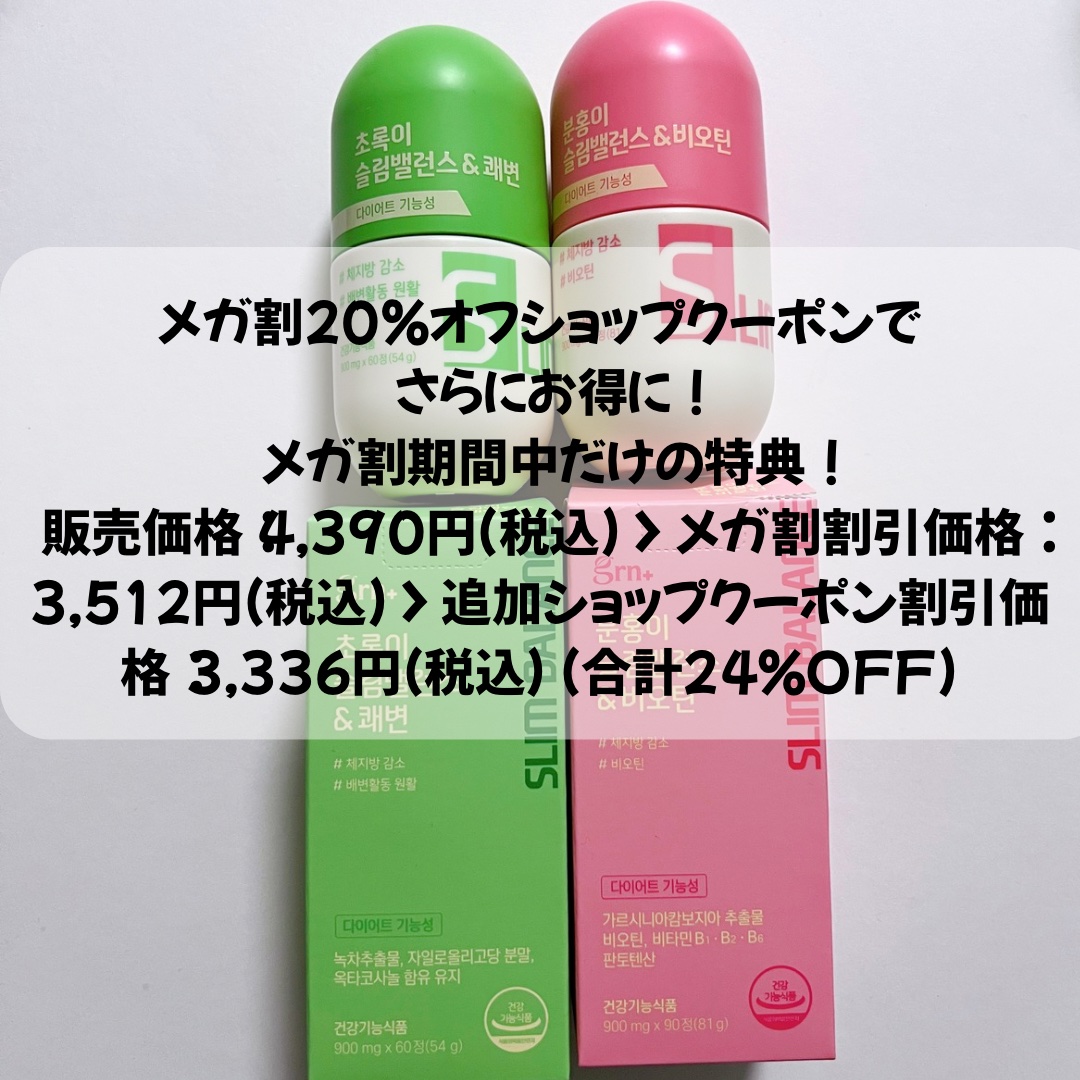 1+1でさらにお得に🉐✨ (1+1)スリムバランスピンク+グリーンを試してみたよ💚🩷 飲むだけ簡単✨ 1回1錠で飲みやすいのも嬉しい💗 薄着になる春夏に向けて 今度こそ一緒に頑張ってみない?😉💖