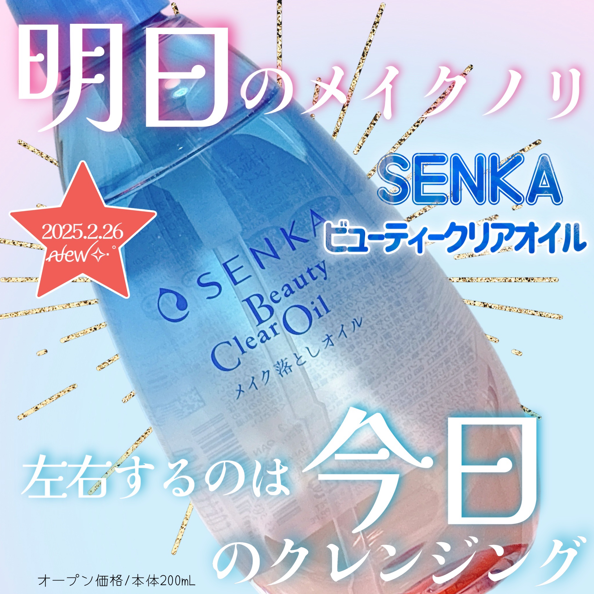 - 明日の化粧ノリ整える新発想*1のクレンジングオイル *1 SENKA内で 1.とろみ感たっぷりのオイルがメイクを絡めとる。 とろみオイルがメイクとよくなじみ、キメの隙間に入り込んだメイクも毛穴の角栓も浮き上がらせる。 2.肌にうるおいをつなぎとめる、うるおいリンクアップテクノロジー搭載 ビューティークリアオイルの「うるおいリンクアップテクノロジー」によって、厳選したうるおいリンク成分*2が保湿成分や水分を抱え込んで肌につなぎとめる! *2 ジオレイン酸ポリグリセリル-10、ジカプリン酸ポリグリセリル-6(乳化剤) 3.2つの美容液成分IN!洗いあがりの肌感まで心地いい 天然由来の天然シルクエッセンス(保湿成分)とハチミツ(保湿成分)を配合。 洗いあがりもうるおいのある肌へ。 2025年1月29日(水)@cosme先行発売 *全国の@cosme STORE展開は2月5日 **@cosme SHOPPINGはビューティークリアオイルのみの取り扱い ***詰め替えも含め全国発売は2月26日