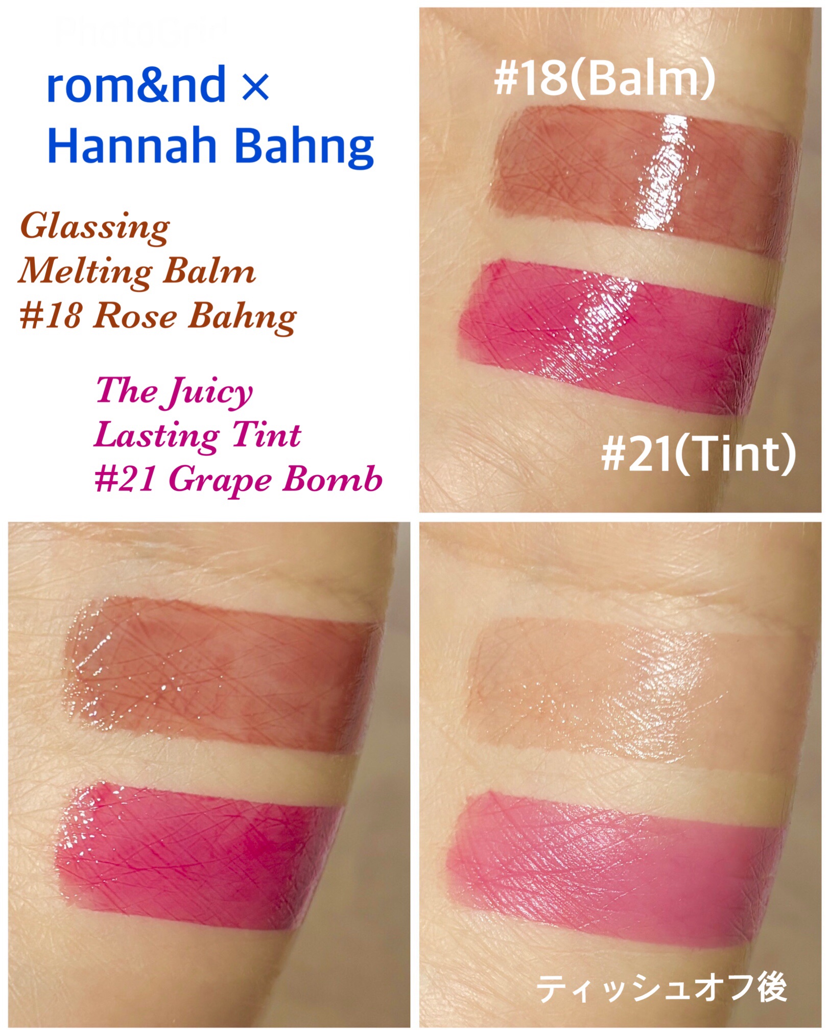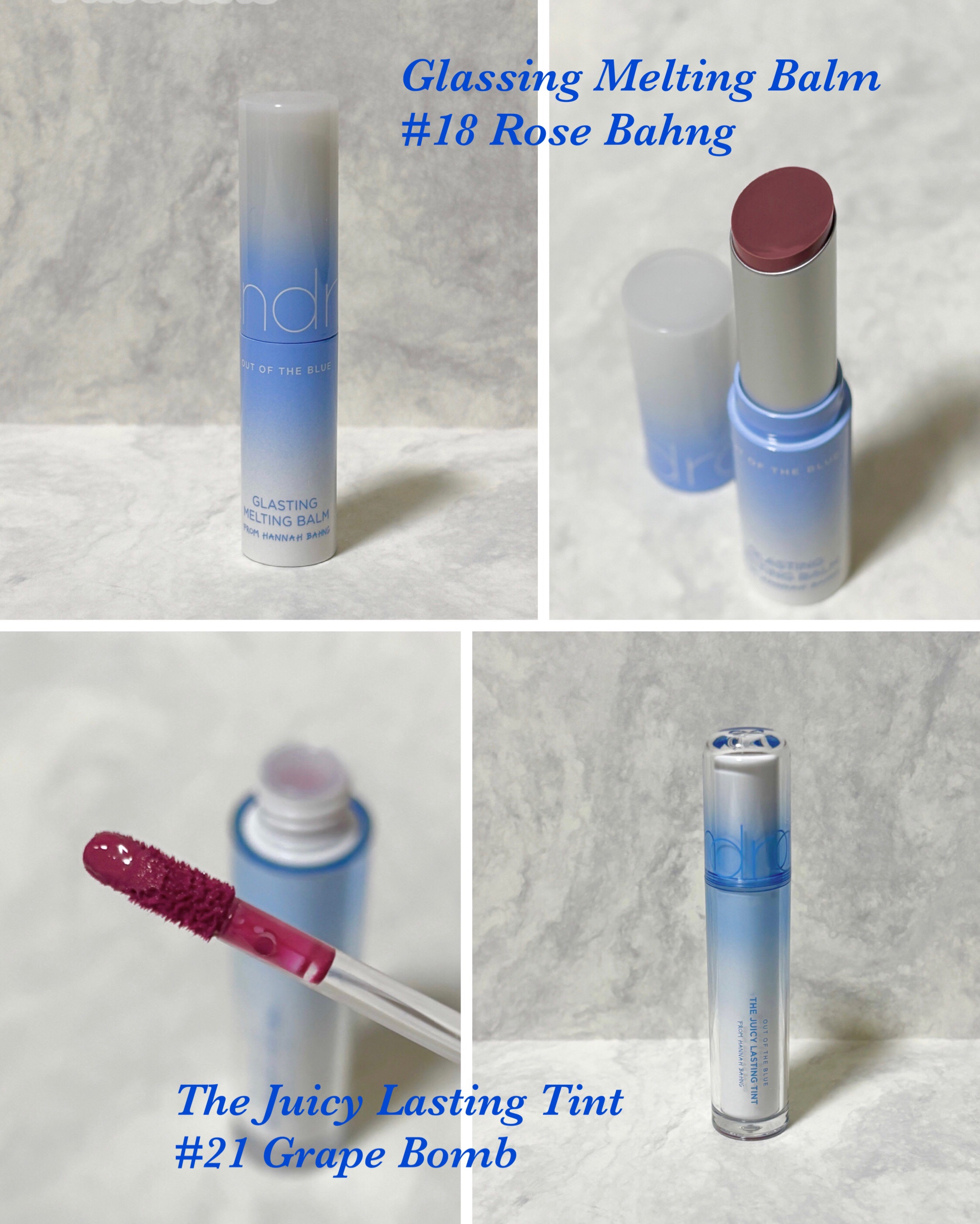 ロムアンド×ハンナバンコラボ💙 かわいすぎるアイテムが数量限定で発売! 全体的に青みのあるカラーバリエーション! どれもかわいくて全種類買ってしまった💦 ザ ジューシーラスティングティントはパケの色は違うけどいつでも買えるのでぜひチェックしてみてね!
