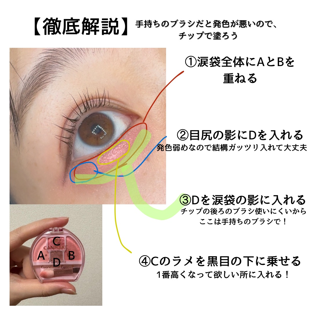 使い込みすぎて底が見え見えの愛用アイシャドウ! キャンメイク パーフェクトマルチアイズ 08スリーズショコラ ¥858 このふんわりピンク粘膜カラー、自然すぎて可愛い。 涙袋に左下の色を仕込むと、めちゃくちゃぷっくりして見える、、 付属のチップは柔らかくて使いやすい。 鏡もひっそりついてるから出先で塗り直しやすい。