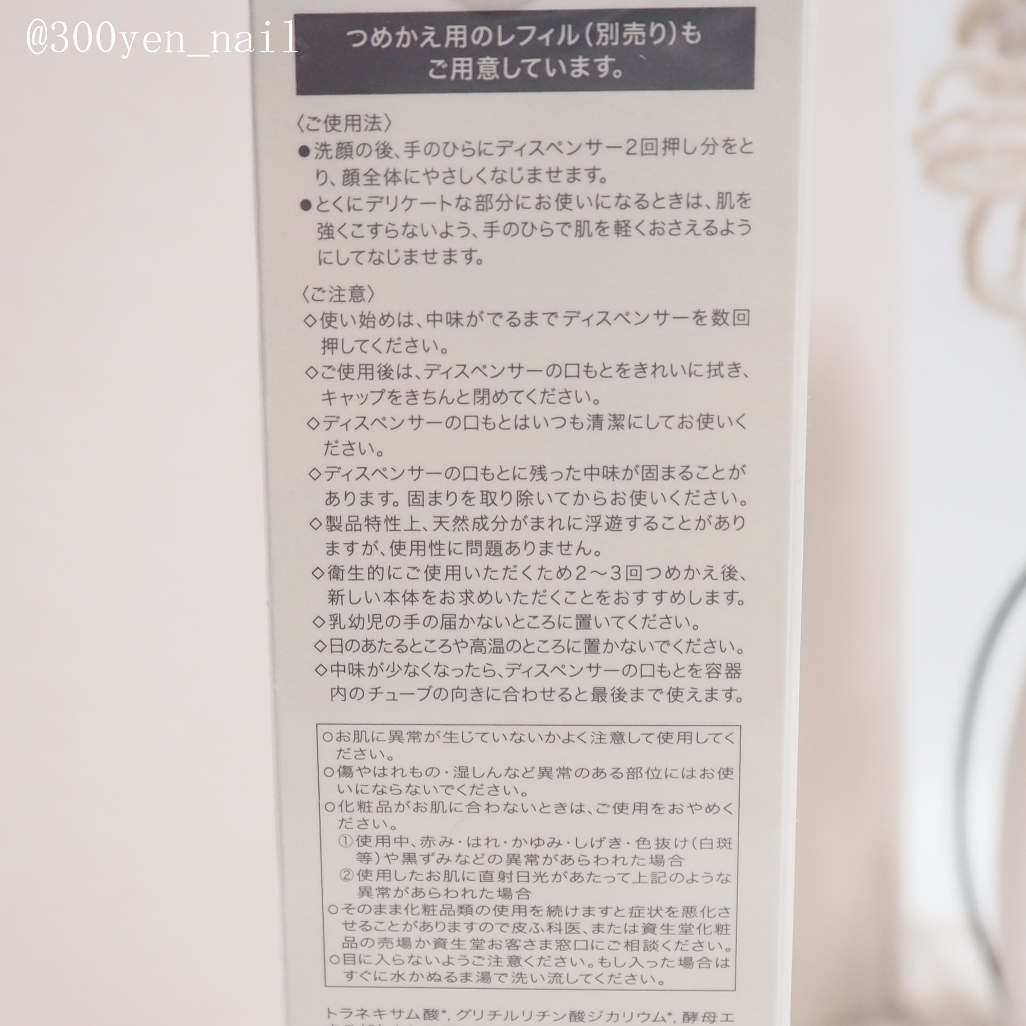 - <本体> 有効成分 トラネキサム酸、グリチルリチン酸ジカリウム その他の成分 酵母エキス(3)、トレハロース、キシリット、エリスリトール、ワセリン、アセチル化ヒアルロン酸ナトリウム、ヨモギエキス(2)、濃グリセリン、精製水、ジプロピレングリコール、1,3-ブチレングリコール、ポリオキシエチレン(17)ポリオキシプロピレン(4)ジメチルエーテル、ポリオキシエチレンメチルグルコシド、ポリオキシエチレン硬化ヒマシ油、ジイソステアリン酸ポリグリセリル、トリ2-エチルヘキサン酸グリセリル、ヒドロキシエチルセルロース、クエン酸、キサンタンガム、クエン酸ナトリウム、メタリン酸ナトリウム、ピロ亜硫酸ナトリウム、ポリオキシエチレン(14)ポリオキシプロピレン(7)ジメチルエーテル、フェノキシエタノール <125mL(レフィル)> 有効成分 トラネキサム酸、グリチルリチン酸ジカリウム その他の成分 酵母エキス(3)、トレハロース、キシリット、エリスリトール、ワセリン、アセチル化ヒアルロン酸ナトリウム、ヨモギエキス(2)、濃グリセリン、精製水、ジプロピレングリコール、1,3-ブチレングリコール、ポリオキシエチレン(17)ポリオキシプロピレン(4)ジメチルエーテル、ポリオキシエチレンメチルグルコシド、ポリオキシエチレン硬化ヒマシ油、ジイソステアリン酸ポリグリセリル、トリ2-エチルヘキサン酸グリセリル、ヒドロキシエチルセルロース、クエン酸、キサンタンガム、クエン酸ナトリウム、メタリン酸ナトリウム、ピロ亜硫酸ナトリウム、ポリオキシエチレン(14)ポリオキシプロピレン(7)ジメチルエーテル、フェノキシエタノール <120mL(レフィル)> 有効成分 トラネキサム酸、グリチルリチン酸ジカリウム その他の成分 酵母エキス(3)、トレハロース、キシリット、エリスリトール、ワセリン、アセチル化ヒアルロン酸ナトリウム、ヨモギエキス(2)、濃グリセリン、精製水、ジプロピレングリコール、1,3-ブチレングリコール、ポリオキシエチレン(17)ポリオキシプロピレン(4)ジメチルエーテル、ポリオキシエチレンメチルグルコシド、ポリオキシエチレン硬化ヒマシ油、ジイソステアリン酸ポリグリセリル、トリ2-エチルヘキサン酸グリセリル、ヒドロキシエチルセルロース、クエン酸、キサンタンガム、クエン酸ナトリウム、メタリン酸ナトリウム、ピロ亜硫酸ナトリウム、ポリオキシエチレン(14)ポリオキシプロピレン(7)ジメチルエーテル、フェノキシエタノール