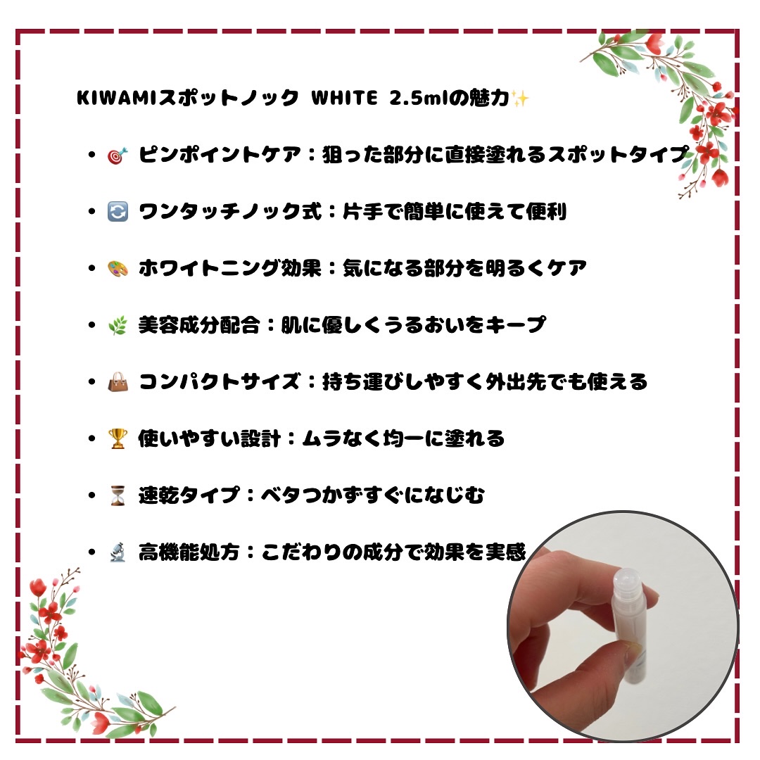 ビタミンC誘導体×ナイアシンをノック式注入器でお肌に打ち込む新発想の美容液。 200μmの極小ニードルでダイレクト注入。成分を直接届ける特殊機構になっており、医療機器メーカーが開発した化粧品グレードの注入器。 気になる部分に直接、届けることが出来る美容液。スポットノック white では、気になる箇所に1ノックで届けることが叶います。