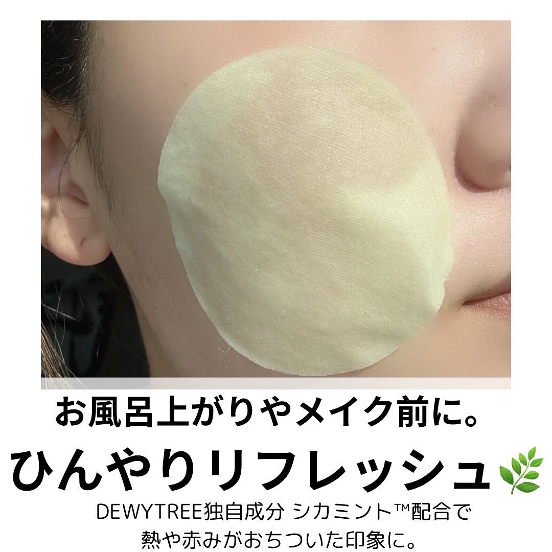 DEWYTREEの独自成分シカミント™が配合。 整肌&クーリング効果◎ お肌の赤みや熱が落ち着いて透明感ある肌を目指せるよ✨ パッドには美容液たっぷりで高密着! ベタつかず程よいしっとり感だからメイク前にもおすすめ🙆♀️