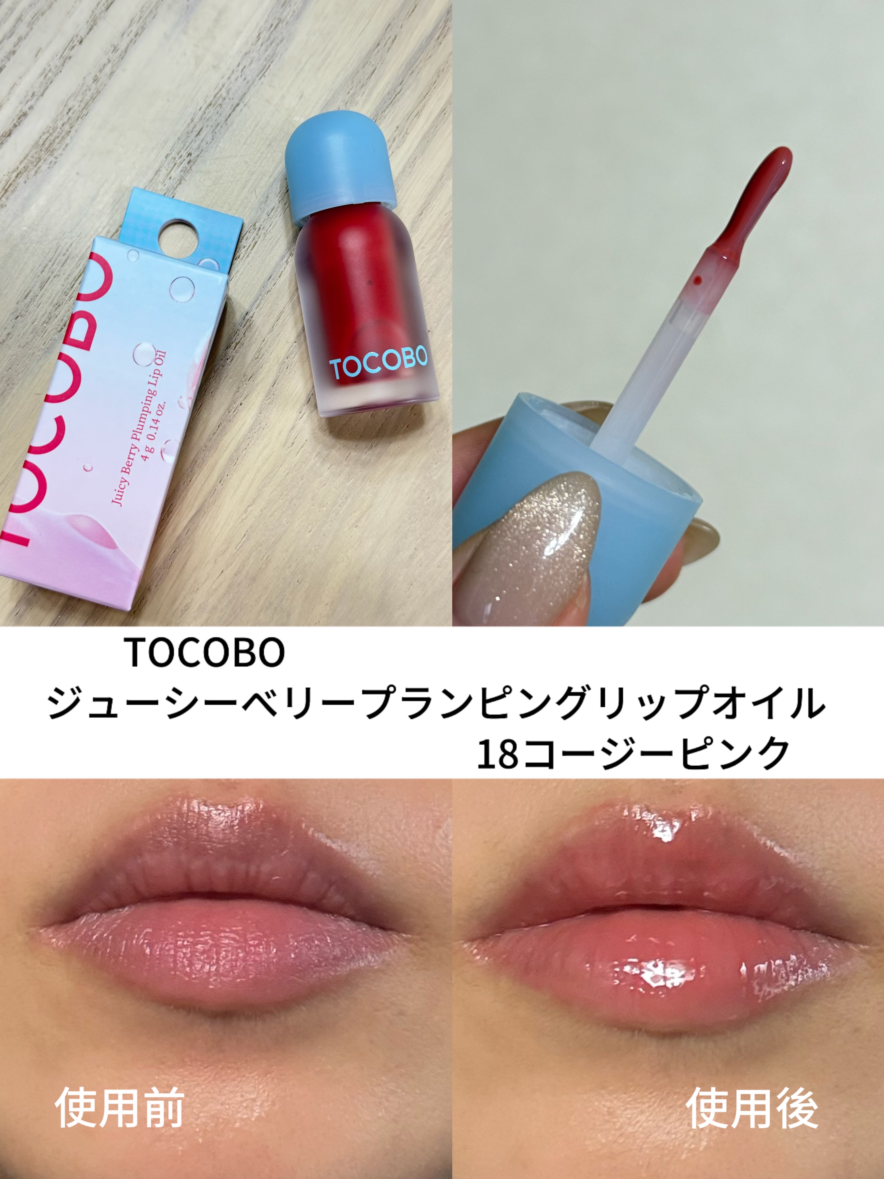 TOCOBOの大人気アイテム うるツヤ粘膜リップ ジューシーベリープランピングリップオイル💄 プランピング効果もあるのでぷるんと唇に🫶🏻💕 スースーするくらいでピリピリ痛かったりはしないので使いやすいです🙆🏻♀️🌟 カラーは程よいくすみ感のあるミューテッドピンクでどのパーソナルカラーの人も使いやすいピンクだと思います🙆🏻♀️💖