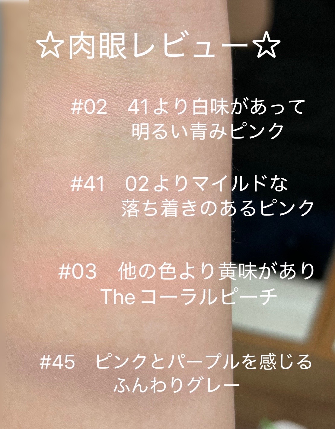 とにかく発色が良い👍🏻 粉質もしっとりさらさらで最高 色々な質感、色があるので選ぶのが楽しかったです 悩みに悩んでピンク系のマットを3個買ったけれど02と41は目に塗ったら多分違い分からない🤣💦
