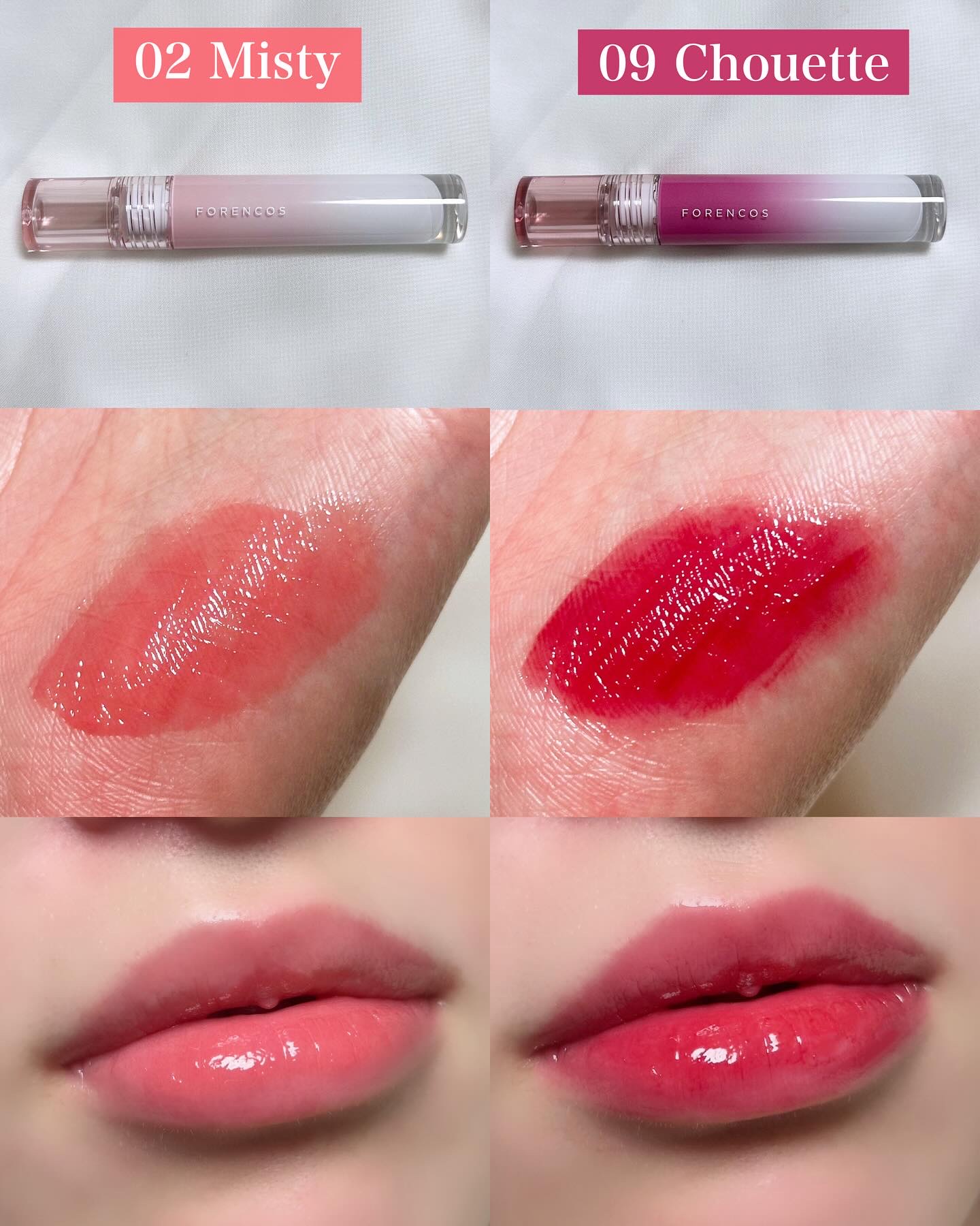 透き通る色彩とちゅるんとした水光ツヤがかわいいフォレンコスのティント♡ 重たさを感じないみずみずしいテクスチャーだけど、唇に馴染ませるとしっかり密着。 02 Misty はまさに美少女カラー めっっっちゃかわいいこの色…!