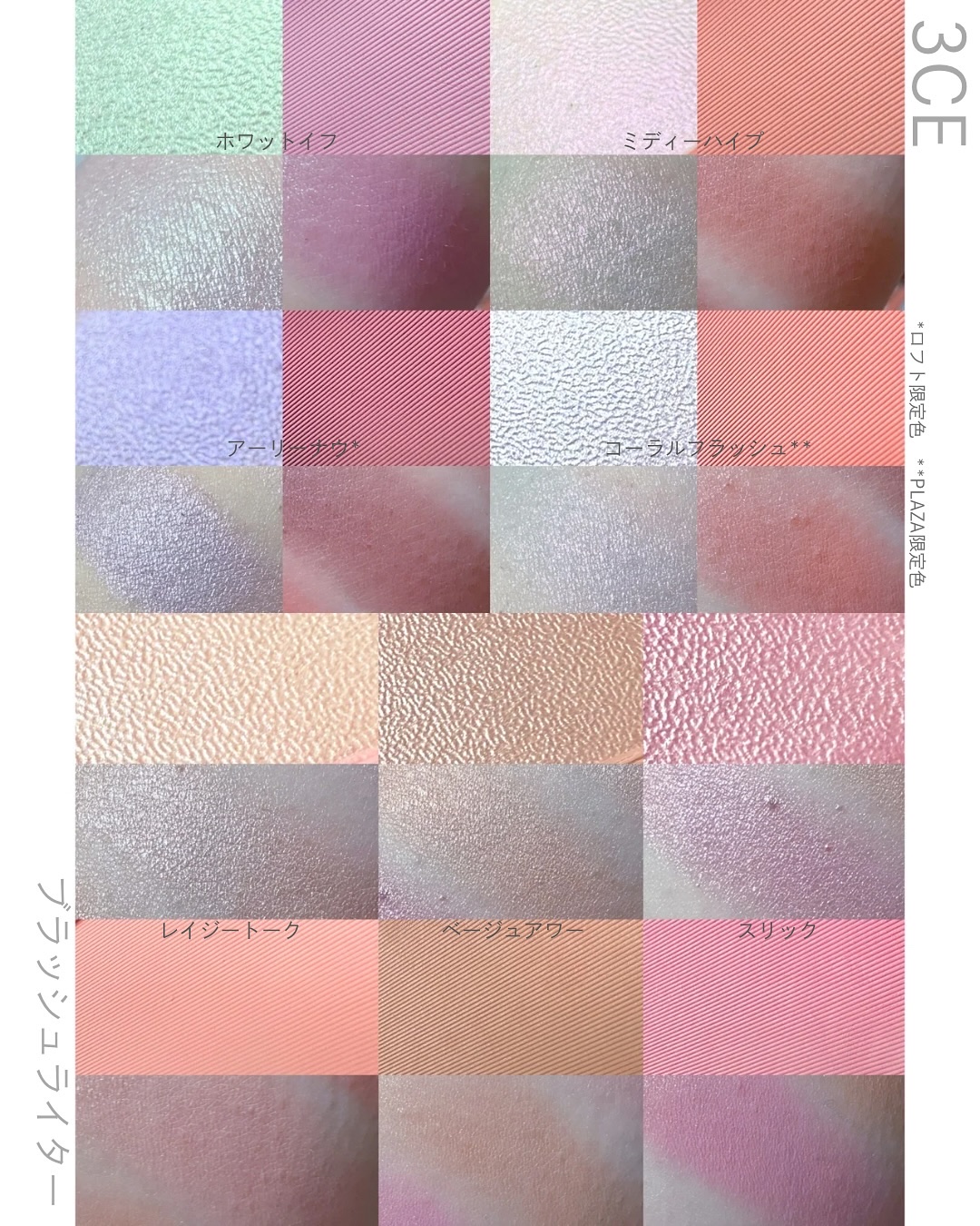 3CEの新作は色相を使った計算し尽くされた配色のハイライト&チーク! 反対色(コントラストカラー)は引き立てあって盛れツヤほっぺに… 私のお気に入りは反対色のアーリーナウ(ロフト限定色)とコーラルフラッシュ(PLAZA限定色)ハイライトカラーがラベンダーとライトブルーでとっても綺麗😍