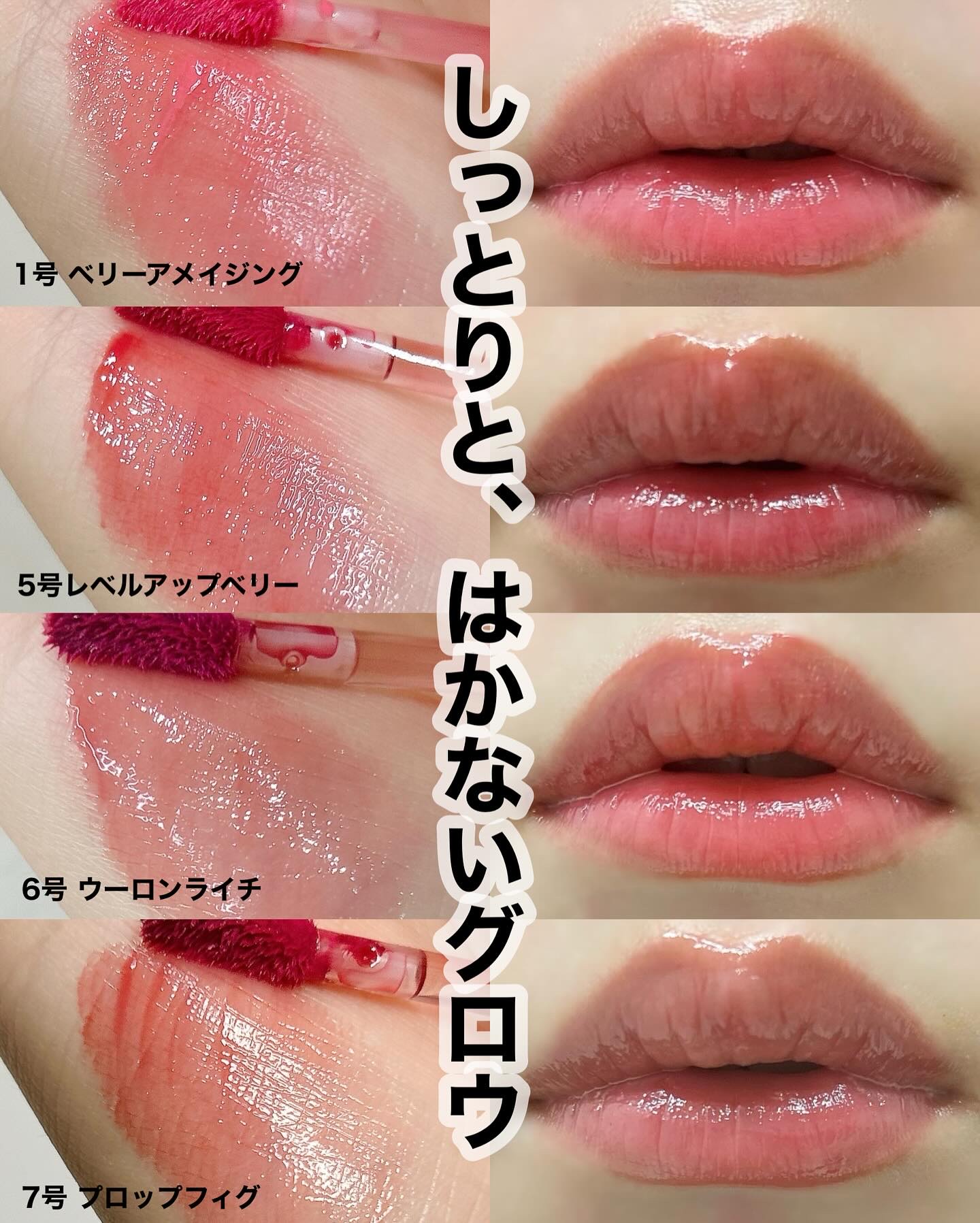 - <01 ベリーアメイジング> 水、デカイソステアリン酸ポリグリセリル-10、ビスジグリセリルポリアシルアジペート-2、ジフェニルジメチコン、フェニルトリメチコン、リンゴ酸ジイソステアリル、水添ポリイソブテン、ジグリセリン、ポリソルベート60、BG、セチルPEG/PPG-10/1ジメチコン、1,2-ヘキサンジオール、ペンチレングリコール、セテアレス-20、(アクリル酸ヒドロキシエチル/アクリロイルジメチルタウリンNa)コポリマー、スクワラン、フェノキシエタノール、エチルヘキシルグリセリン、香料、黄5、酸化チタン、イソステアリン酸ソルビタン、赤104(1)、赤227、水酸化Al、ポリアクリル酸アンモニウム、トコフェロール <02 アプリコットデュー> 水、デカイソステアリン酸ポリグリセリル-10、ビスジグリセリルポリアシルアジペート-2、ジフェニルジメチコン、フェニルトリメチコン、リンゴ酸ジイソステアリル、水添ポリイソブテン、ジグリセリン、ポリソルベート60、BG、セチルPEG/PPG-10/1ジメチコン、1,2-ヘキサンジオール、ペンチレングリコール、セテアレス-20、(アクリル酸ヒドロキシエチル/アクリロイルジメチルタウリンNa)コポリマー、スクワラン、フェノキシエタノール、酸化チタン、エチルヘキシルグリセリン、香料、黄4、黄5、イソステアリン酸ソルビタン、赤227、赤104(1)、水酸化Al、ポリアクリル酸アンモニウム、青1、トコフェロール <03 メリーピーチ> 水、デカイソステアリン酸ポリグリセリル-10、ビスジグリセリルポリアシルアジペート-2、ジフェニルジメチコン、フェニルトリメチコン、リンゴ酸ジイソステアリル、水添ポリイソブテン、ジグリセリン、ポリソルベート60、BG、セチルPEG/PPG-10/1ジメチコン、1,2-ヘキサンジオール、ペンチレングリコール、セテアレス-20、(アクリル酸ヒドロキシエチル/アクリロイルジメチルタウリンNa)コポリマー、スクワラン、フェノキシエタノール、酸化チタン、エチルヘキシルグリセリン、香料、黄4、赤227、イソステアリン酸ソルビタン、黄5、赤104(1)、水酸化Al、ポリアクリル酸アンモニウム、青1、トコフェロール <04 プラウドグレープ> 水、デカイソステアリン酸ポリグリセリル-10、ビスジグリセリルポリアシルアジペート-2、ジフェニルジメチコン、フェニルトリメチコン、リンゴ酸ジイソステアリル、水添ポリイソブテン、ジグリセリン、ポリソルベート60、BG、セチルPEG/PPG-10/1ジメチコン、1,2-ヘキサンジオール、ペンチレングリコール、セテアレス-20、(アクリル酸ヒドロキシエチル/アクリロイルジメチルタウリンNa)コポリマー、スクワラン、フェノキシエタノール、エチルヘキシルグリセリン、酸化チタン、香料、赤104(1)、黄4、イソステアリン酸ソルビタン、赤227、水酸化Al、ポリアクリル酸アンモニウム、青1、トコフェロール <05 レベルアップベリー> 水、デカイソステアリン酸ポリグリセリル-10、ビスジグリセリルポリアシルアジペート-2、ジフェニルジメチコン、フェニルトリメチコン、リンゴ酸ジイソステアリル、水添ポリイソブテン、ジグリセリン、ポリソルベート60、BG、セチルPEG/PPG-10/1ジメチコン、1,2-ヘキサンジオール、ペンチレングリコール、セテアレス-20、(アクリル酸ヒドロキシエチル/アクリロイルジメチルタウリンNa)コポリマー、スクワラン、フェノキシエタノール、エチルヘキシルグリセリン、香料、黄5、赤227、イソステアリン酸ソルビタン、青1、トコフェロール <06 ウーロンライチ> 水、デカイソステアリン酸ポリグリセリル-10、ビスジグリセリルポリアシルアジペート-2、ジフェニルジメチコン、フェニルトリメチコン、リンゴ酸ジイソステアリル、水添ポリイソブテン、ジグリセリン、ポリソルベート60、BG、セチルPEG/PPG-10/1ジメチコン、1,2-ヘキサンジオール、ペンチレングリコール、セテアレス-20、(アクリル酸ヒドロキシエチル/アクリロイルジメチルタウリンNa)コポリマー、スクワラン、フェノキシエタノール、酸化チタン、エチルヘキシルグリセリン、赤227、黄4、香料、イソステアリン酸ソルビタン、水酸化Al、ポリアクリル酸アンモニウム、青1、トコフェロール <07 プロップフィグ> 水、デカイソステアリン酸ポリグリセリル-10、ビスジグリセリルポリアシルアジペート-2、ジフェニルジメチコン、フェニルトリメチコン、リンゴ酸ジイソステアリル、水添ポリイソブテン、ジグリセリン、ポリソルベート60、BG、セチルPEG/PPG-10/1ジメチコン、1,2-ヘキサンジオール、ペンチレングリコール、セテアレス-20、(アクリル酸ヒドロキシエチル/アクリロイルジメチルタウリンNa)コポリマー、スクワラン、フェノキシエタノール、エチルヘキシルグリセリン、黄5、赤227、香料、イソステアリン酸ソルビタン、青1、トコフェロール <08 ジョイフルパーシモン> 水、デカイソステアリン酸ポリグリセリル-10、ビスジグリセリルポリアシルアジペート-2、ジフェニルジメチコン、フェニルトリメチコン、リンゴ酸ジイソステアリル、水添ポリイソブテン、ジグリセ