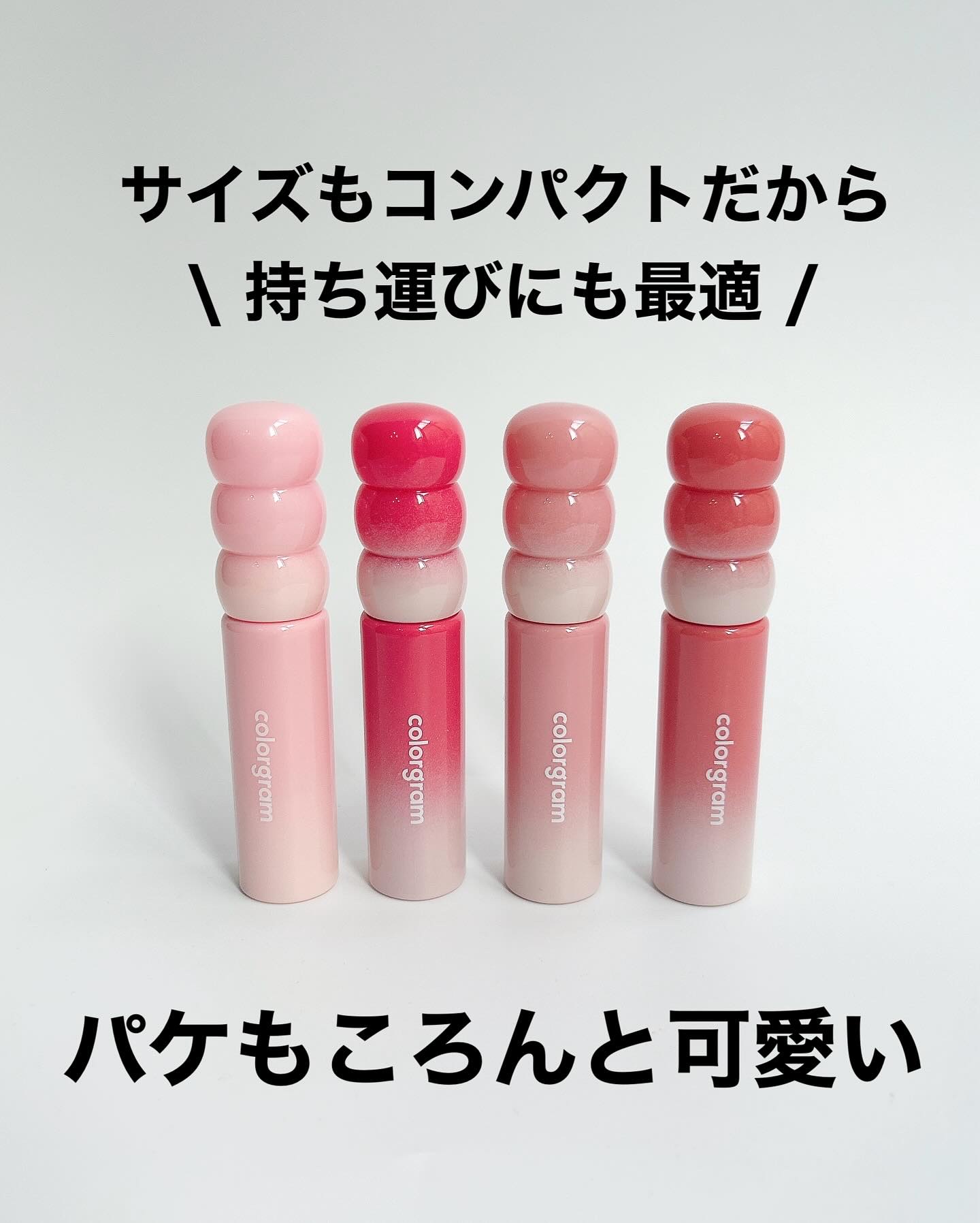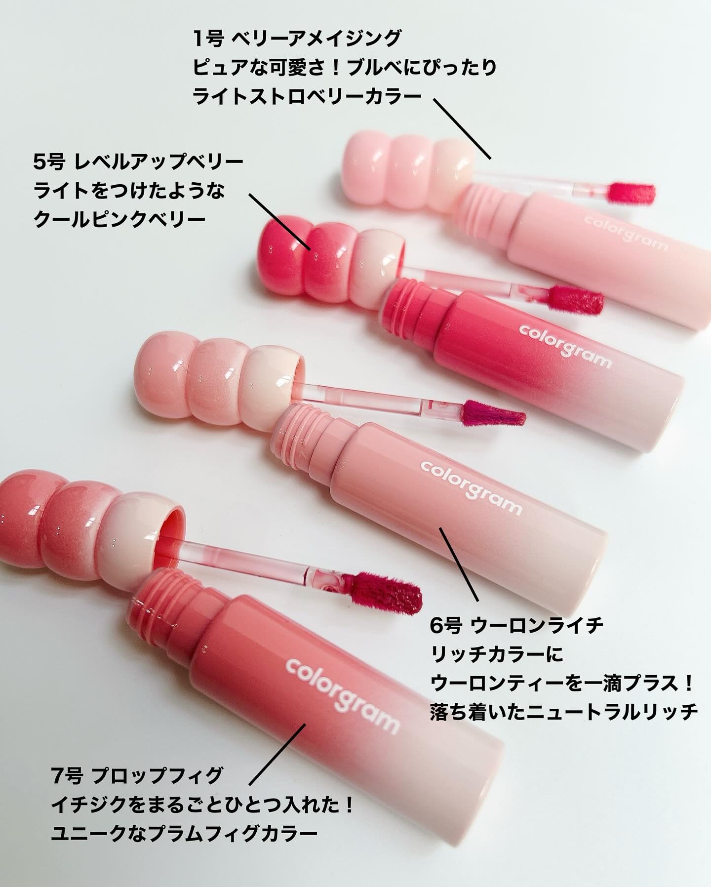 あのタンフルティントで有名なcolorgramから新ティント登場!8色展開でメガ割初日に発売されたよ~🌸 まるで唇にスキンケアをしたような良い塗り心地が魅力のやさしくフィット 濡れ感のある唇がいい感じだよ🥹💋✨