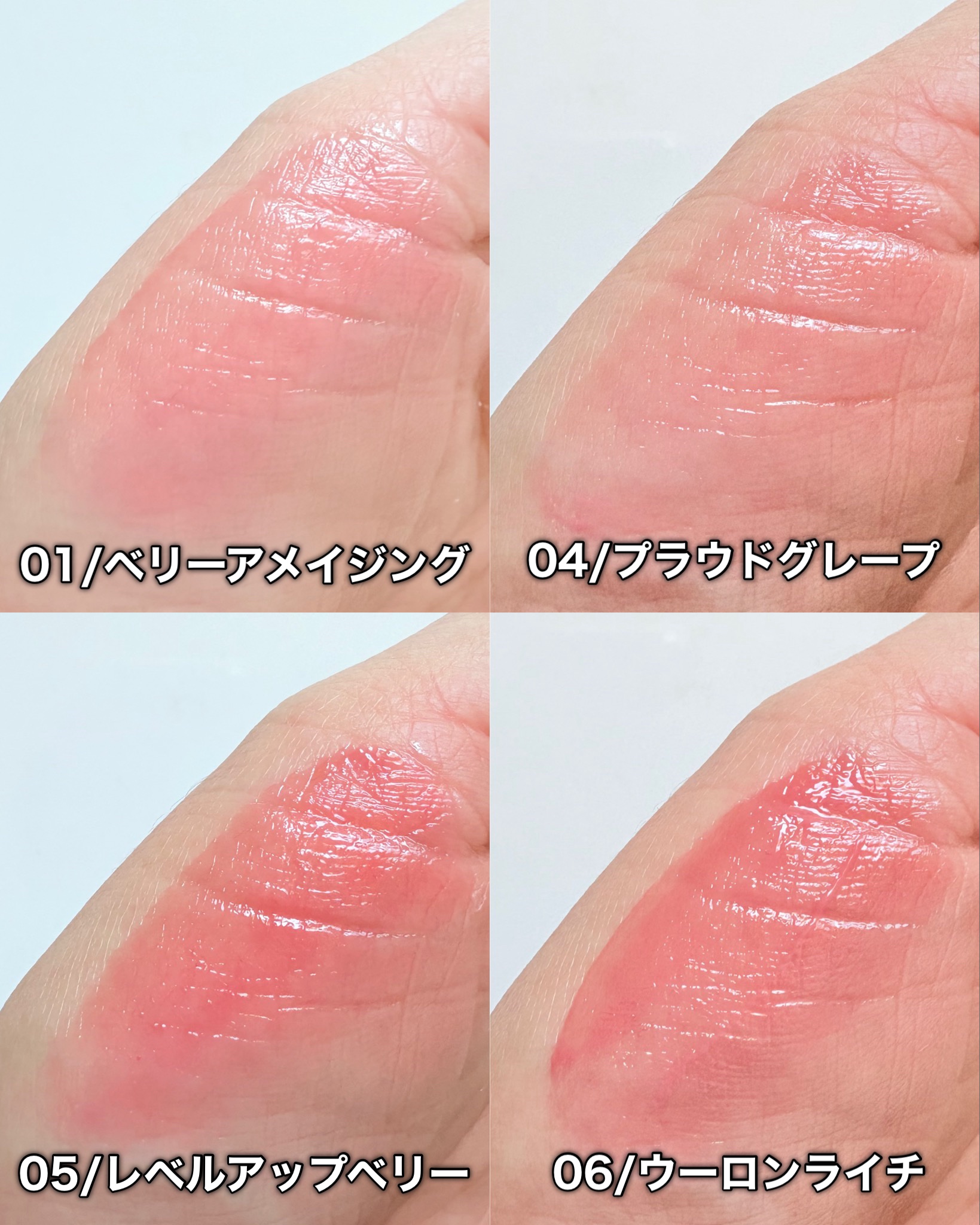 - <01 ベリーアメイジング> 水、デカイソステアリン酸ポリグリセリル-10、ビスジグリセリルポリアシルアジペート-2、ジフェニルジメチコン、フェニルトリメチコン、リンゴ酸ジイソステアリル、水添ポリイソブテン、ジグリセリン、ポリソルベート60、BG、セチルPEG/PPG-10/1ジメチコン、1,2-ヘキサンジオール、ペンチレングリコール、セテアレス-20、(アクリル酸ヒドロキシエチル/アクリロイルジメチルタウリンNa)コポリマー、スクワラン、フェノキシエタノール、エチルヘキシルグリセリン、香料、黄5、酸化チタン、イソステアリン酸ソルビタン、赤104(1)、赤227、水酸化Al、ポリアクリル酸アンモニウム、トコフェロール <02 アプリコットデュー> 水、デカイソステアリン酸ポリグリセリル-10、ビスジグリセリルポリアシルアジペート-2、ジフェニルジメチコン、フェニルトリメチコン、リンゴ酸ジイソステアリル、水添ポリイソブテン、ジグリセリン、ポリソルベート60、BG、セチルPEG/PPG-10/1ジメチコン、1,2-ヘキサンジオール、ペンチレングリコール、セテアレス-20、(アクリル酸ヒドロキシエチル/アクリロイルジメチルタウリンNa)コポリマー、スクワラン、フェノキシエタノール、酸化チタン、エチルヘキシルグリセリン、香料、黄4、黄5、イソステアリン酸ソルビタン、赤227、赤104(1)、水酸化Al、ポリアクリル酸アンモニウム、青1、トコフェロール <03 メリーピーチ> 水、デカイソステアリン酸ポリグリセリル-10、ビスジグリセリルポリアシルアジペート-2、ジフェニルジメチコン、フェニルトリメチコン、リンゴ酸ジイソステアリル、水添ポリイソブテン、ジグリセリン、ポリソルベート60、BG、セチルPEG/PPG-10/1ジメチコン、1,2-ヘキサンジオール、ペンチレングリコール、セテアレス-20、(アクリル酸ヒドロキシエチル/アクリロイルジメチルタウリンNa)コポリマー、スクワラン、フェノキシエタノール、酸化チタン、エチルヘキシルグリセリン、香料、黄4、赤227、イソステアリン酸ソルビタン、黄5、赤104(1)、水酸化Al、ポリアクリル酸アンモニウム、青1、トコフェロール <04 プラウドグレープ> 水、デカイソステアリン酸ポリグリセリル-10、ビスジグリセリルポリアシルアジペート-2、ジフェニルジメチコン、フェニルトリメチコン、リンゴ酸ジイソステアリル、水添ポリイソブテン、ジグリセリン、ポリソルベート60、BG、セチルPEG/PPG-10/1ジメチコン、1,2-ヘキサンジオール、ペンチレングリコール、セテアレス-20、(アクリル酸ヒドロキシエチル/アクリロイルジメチルタウリンNa)コポリマー、スクワラン、フェノキシエタノール、エチルヘキシルグリセリン、酸化チタン、香料、赤104(1)、黄4、イソステアリン酸ソルビタン、赤227、水酸化Al、ポリアクリル酸アンモニウム、青1、トコフェロール <05 レベルアップベリー> 水、デカイソステアリン酸ポリグリセリル-10、ビスジグリセリルポリアシルアジペート-2、ジフェニルジメチコン、フェニルトリメチコン、リンゴ酸ジイソステアリル、水添ポリイソブテン、ジグリセリン、ポリソルベート60、BG、セチルPEG/PPG-10/1ジメチコン、1,2-ヘキサンジオール、ペンチレングリコール、セテアレス-20、(アクリル酸ヒドロキシエチル/アクリロイルジメチルタウリンNa)コポリマー、スクワラン、フェノキシエタノール、エチルヘキシルグリセリン、香料、黄5、赤227、イソステアリン酸ソルビタン、青1、トコフェロール <06 ウーロンライチ> 水、デカイソステアリン酸ポリグリセリル-10、ビスジグリセリルポリアシルアジペート-2、ジフェニルジメチコン、フェニルトリメチコン、リンゴ酸ジイソステアリル、水添ポリイソブテン、ジグリセリン、ポリソルベート60、BG、セチルPEG/PPG-10/1ジメチコン、1,2-ヘキサンジオール、ペンチレングリコール、セテアレス-20、(アクリル酸ヒドロキシエチル/アクリロイルジメチルタウリンNa)コポリマー、スクワラン、フェノキシエタノール、酸化チタン、エチルヘキシルグリセリン、赤227、黄4、香料、イソステアリン酸ソルビタン、水酸化Al、ポリアクリル酸アンモニウム、青1、トコフェロール <07 プロップフィグ> 水、デカイソステアリン酸ポリグリセリル-10、ビスジグリセリルポリアシルアジペート-2、ジフェニルジメチコン、フェニルトリメチコン、リンゴ酸ジイソステアリル、水添ポリイソブテン、ジグリセリン、ポリソルベート60、BG、セチルPEG/PPG-10/1ジメチコン、1,2-ヘキサンジオール、ペンチレングリコール、セテアレス-20、(アクリル酸ヒドロキシエチル/アクリロイルジメチルタウリンNa)コポリマー、スクワラン、フェノキシエタノール、エチルヘキシルグリセリン、黄5、赤227、香料、イソステアリン酸ソルビタン、青1、トコフェロール <08 ジョイフルパーシモン> 水、デカイソステアリン酸ポリグリセリル-10、ビスジグリセリルポリアシルアジペート-2、ジフェニルジメチコン、フェニルトリメチコン、リンゴ酸ジイソステアリル、水添ポリイソブテン、ジグリセ