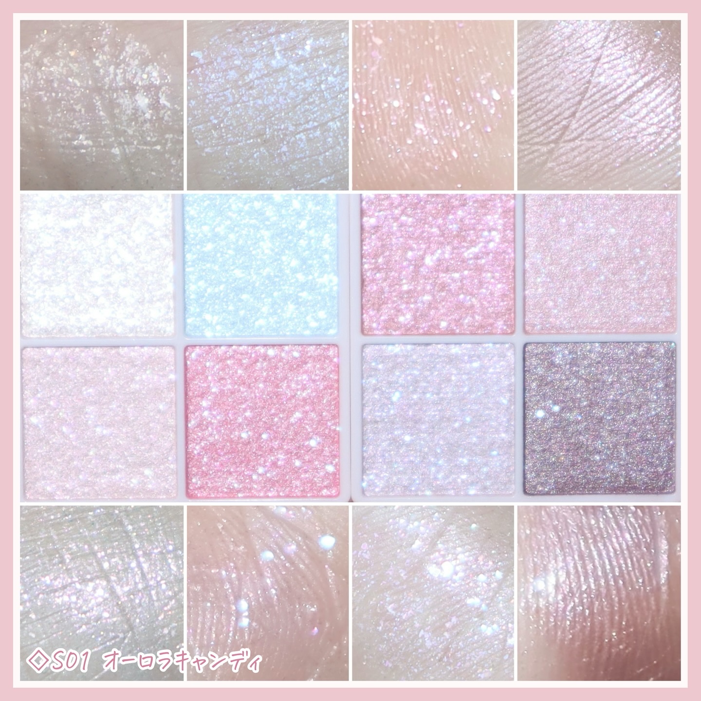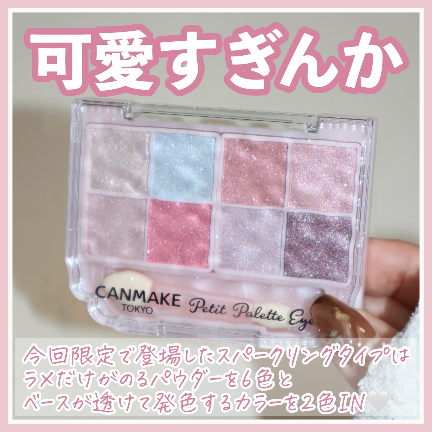 - いつでも一緒💗多色なのに持ち歩ける! 8色入りアイシャドウパレットのラメバージョン✨ 持ち運びやすいサイズ感なのに、贅沢に8色入り&便利なダブルエンドチップ付。 これ1つでアイシャドウが完成するように、 スパークリングタイプは「ラメだけがのるパウダー」を6色、 「ベースが透けて発色するパウダー」を2色セットしています! 使い道に困るような大きすぎるラメではなく、 使いやすさを重視し普段のメイクにも取り入れやすいサイズの ラメを採用しました♪ 他のアイシャドウに合わせて使うのもオススメです✨