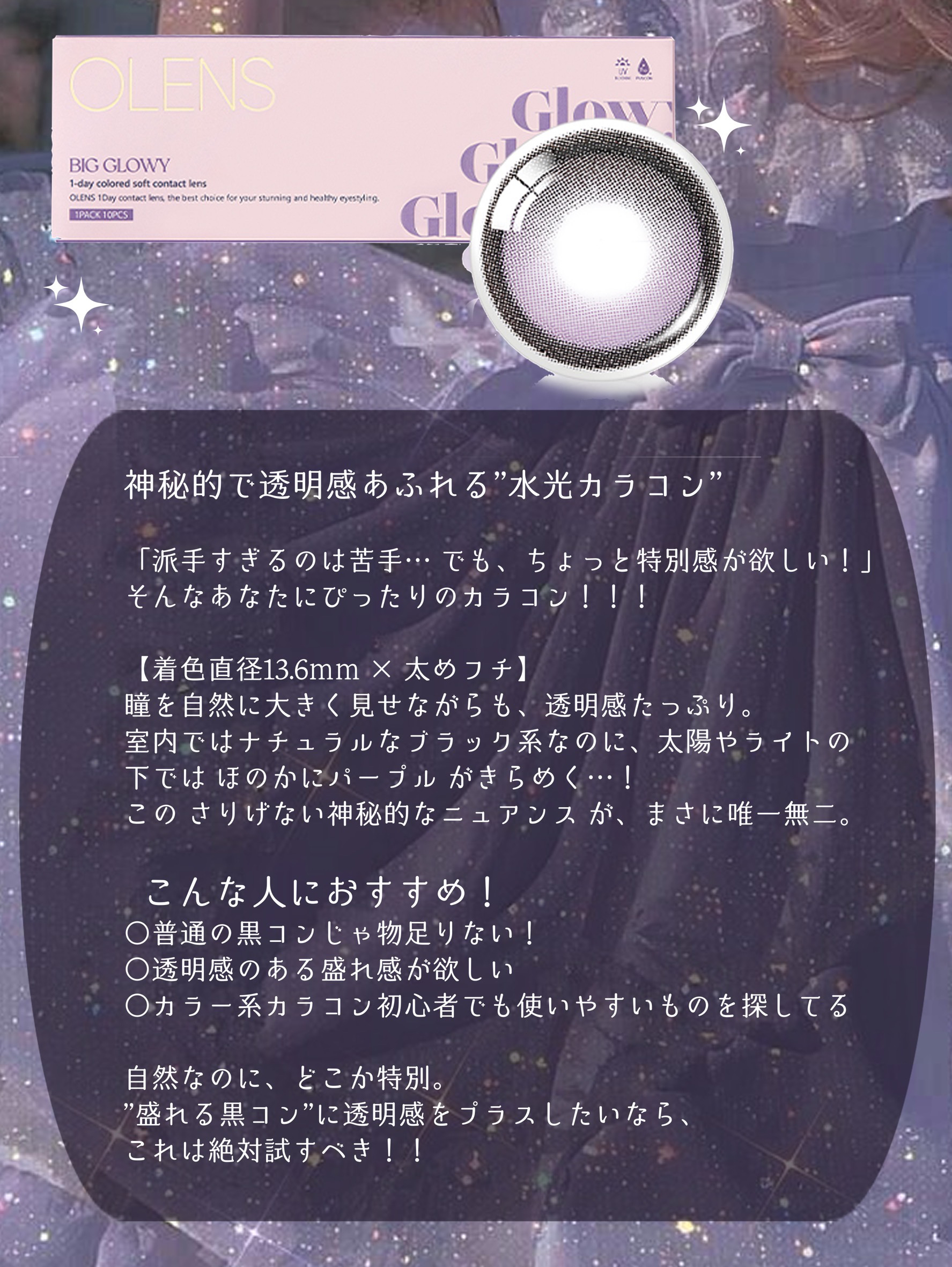 OLENSBigGlowy1day(ラベンダー)これめっっっっっちゃ可愛い!!!!!!!!!ミステリアスで甘すぎない。ラベンダーのハイライター&太フチでちゅるんと盛れます。日に当たった時に神秘的な紫の瞳に見せてくれるのも好き。ラベンダー系カラ...