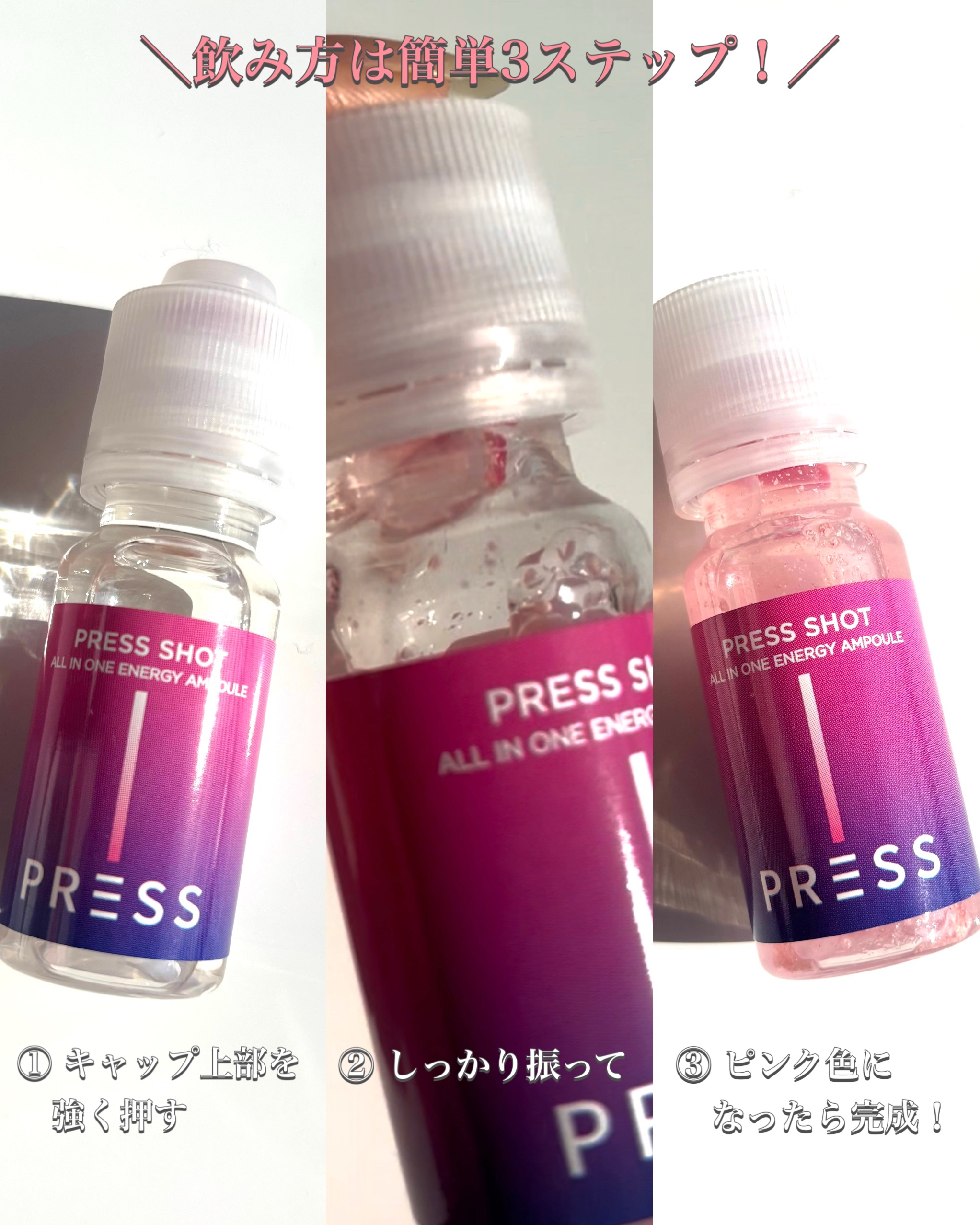 - ・PRESSしてSHAKEするだけ!魔法のようなピンクビタミンに! ・飲むインナービューティー ・飲むピンクビタミン ・粉末にはビタミン B12/D/E、葉酸、ナイアシン、亜鉛が含まれています ・吸収力を重視した液状タイプでの商品設計 ・特許取得の特殊キャップにビタミンを真空密封 ・ビタミンB群を集中配合 ・ビタミンB12は1日の基準値に対し16,667%配合 ・液体は11種類のアミノ酸で吸収しやすい設計 ・飲む瞬間にキャップを押す⇒ビタミンが液体に混ざりフレッシュなビタミンドリンクが完成! 【注意事項】 ・高カルシウム血症がある場合、または医薬品を服用されている方は専門家に相談してください。 ・体に異変を感じた場合は使用を中止し、速やかに専門家に相談してください。 ●本品は、多量摂取により疾病が治癒したり、より健康が増進するものではありません。 亜鉛の摂り過ぎは、銅の吸収を阻害するおそれがありますので、過剰摂取にならないよう注意してください。一日の摂取目安量を守ってください。乳幼児・小児は本品の摂取を避けてください。 ●本品は、特定保健用食品と異なり、消費者庁長官による個別審査を受けたものではありません。 ●食生活は、主食、主菜、副菜を基本に、食事のバランスを。 ●本品製造工場では卵、小麦、そば、落花生、えび、かに、くるみを含む製品を製造しています。 ●摂取目安量:1日当たり1本を目安にお飲みください。 ●摂取の方法:キャップを押すと粉末が落ちます。上下に振り、混ぜてからお飲みください。※粉末が固まる場合がございますが、品質には問題ありません。よく振ってからお飲みください。 2024年12月中旬より全国のウエルシア薬局とロフト※にて先行販売をいたします。 ※一部お取り扱いがない店舗がございます。