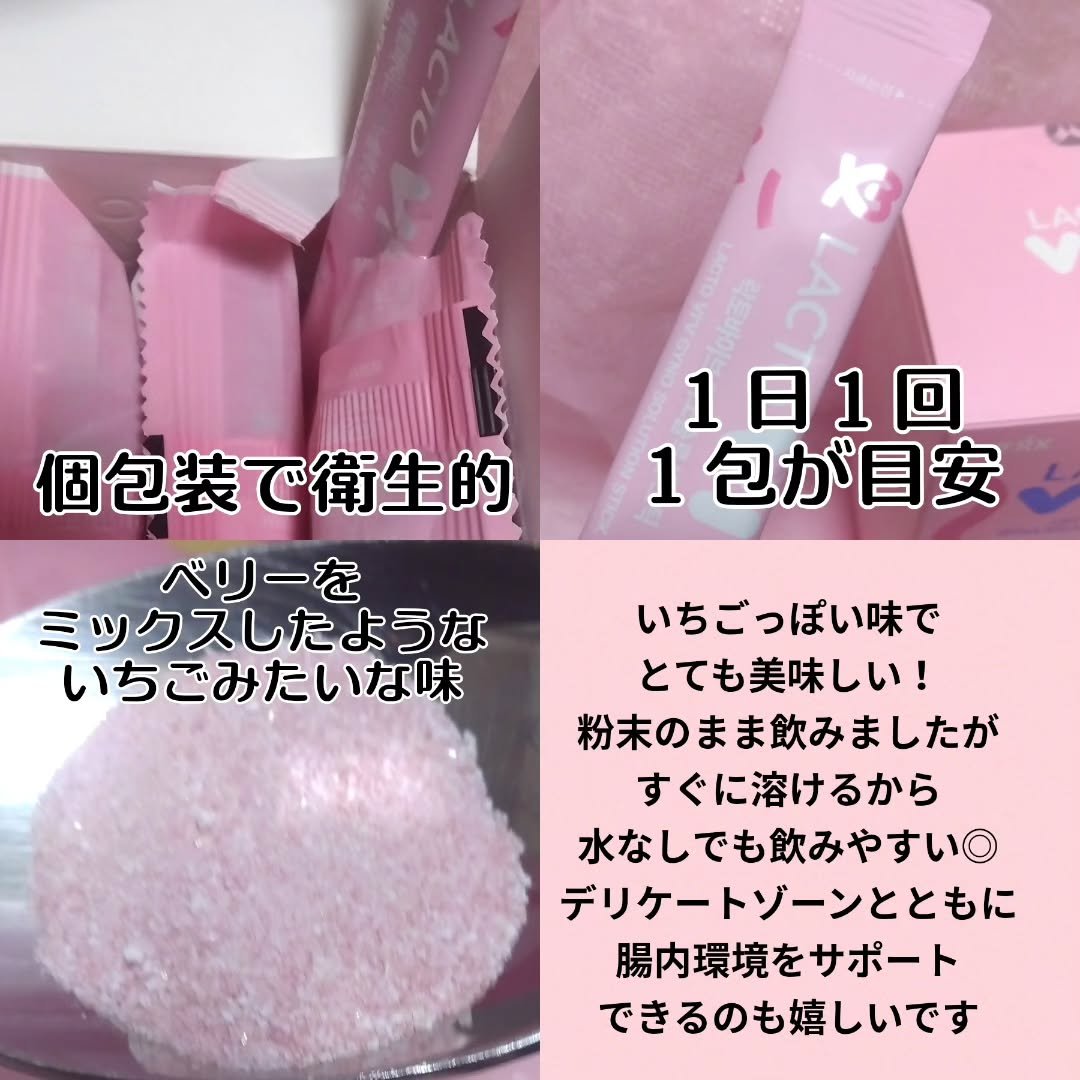 女性のお悩みに寄り添ってくれる心強いインナーケア✨ 有益な乳酸菌が50億個も‼︎ 膣内環境をはじめ、腸内環境も整えてくれるのが嬉しい☺️ 粉末で飲みやすいベリー味🍓 細かいパウダーで直接飲んでもお水に溶かしても飲みやすい🥰