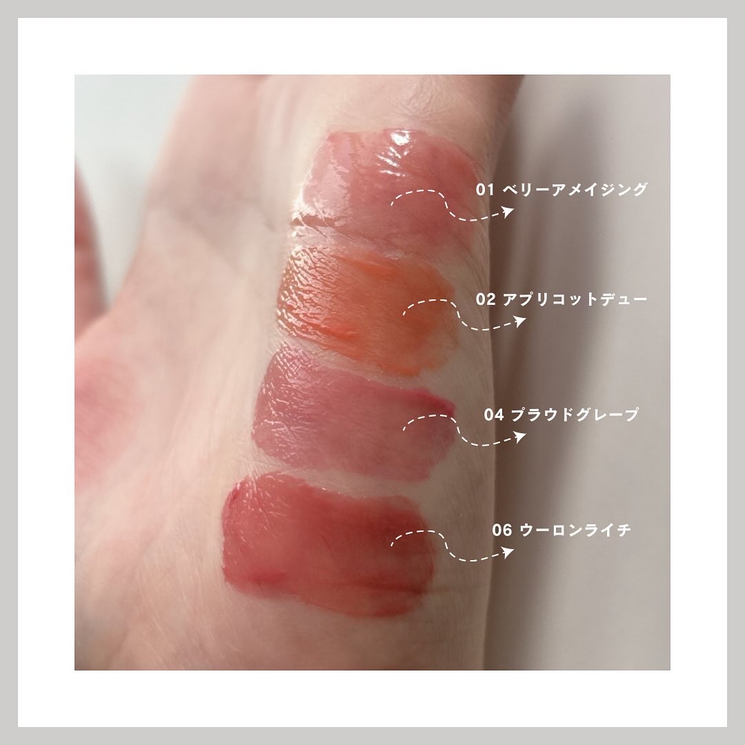- <01 ベリーアメイジング> 水、デカイソステアリン酸ポリグリセリル-10、ビスジグリセリルポリアシルアジペート-2、ジフェニルジメチコン、フェニルトリメチコン、リンゴ酸ジイソステアリル、水添ポリイソブテン、ジグリセリン、ポリソルベート60、BG、セチルPEG/PPG-10/1ジメチコン、1,2-ヘキサンジオール、ペンチレングリコール、セテアレス-20、(アクリル酸ヒドロキシエチル/アクリロイルジメチルタウリンNa)コポリマー、スクワラン、フェノキシエタノール、エチルヘキシルグリセリン、香料、黄5、酸化チタン、イソステアリン酸ソルビタン、赤104(1)、赤227、水酸化Al、ポリアクリル酸アンモニウム、トコフェロール <02 アプリコットデュー> 水、デカイソステアリン酸ポリグリセリル-10、ビスジグリセリルポリアシルアジペート-2、ジフェニルジメチコン、フェニルトリメチコン、リンゴ酸ジイソステアリル、水添ポリイソブテン、ジグリセリン、ポリソルベート60、BG、セチルPEG/PPG-10/1ジメチコン、1,2-ヘキサンジオール、ペンチレングリコール、セテアレス-20、(アクリル酸ヒドロキシエチル/アクリロイルジメチルタウリンNa)コポリマー、スクワラン、フェノキシエタノール、酸化チタン、エチルヘキシルグリセリン、香料、黄4、黄5、イソステアリン酸ソルビタン、赤227、赤104(1)、水酸化Al、ポリアクリル酸アンモニウム、青1、トコフェロール <03 メリーピーチ> 水、デカイソステアリン酸ポリグリセリル-10、ビスジグリセリルポリアシルアジペート-2、ジフェニルジメチコン、フェニルトリメチコン、リンゴ酸ジイソステアリル、水添ポリイソブテン、ジグリセリン、ポリソルベート60、BG、セチルPEG/PPG-10/1ジメチコン、1,2-ヘキサンジオール、ペンチレングリコール、セテアレス-20、(アクリル酸ヒドロキシエチル/アクリロイルジメチルタウリンNa)コポリマー、スクワラン、フェノキシエタノール、酸化チタン、エチルヘキシルグリセリン、香料、黄4、赤227、イソステアリン酸ソルビタン、黄5、赤104(1)、水酸化Al、ポリアクリル酸アンモニウム、青1、トコフェロール <04 プラウドグレープ> 水、デカイソステアリン酸ポリグリセリル-10、ビスジグリセリルポリアシルアジペート-2、ジフェニルジメチコン、フェニルトリメチコン、リンゴ酸ジイソステアリル、水添ポリイソブテン、ジグリセリン、ポリソルベート60、BG、セチルPEG/PPG-10/1ジメチコン、1,2-ヘキサンジオール、ペンチレングリコール、セテアレス-20、(アクリル酸ヒドロキシエチル/アクリロイルジメチルタウリンNa)コポリマー、スクワラン、フェノキシエタノール、エチルヘキシルグリセリン、酸化チタン、香料、赤104(1)、黄4、イソステアリン酸ソルビタン、赤227、水酸化Al、ポリアクリル酸アンモニウム、青1、トコフェロール <05 レベルアップベリー> 水、デカイソステアリン酸ポリグリセリル-10、ビスジグリセリルポリアシルアジペート-2、ジフェニルジメチコン、フェニルトリメチコン、リンゴ酸ジイソステアリル、水添ポリイソブテン、ジグリセリン、ポリソルベート60、BG、セチルPEG/PPG-10/1ジメチコン、1,2-ヘキサンジオール、ペンチレングリコール、セテアレス-20、(アクリル酸ヒドロキシエチル/アクリロイルジメチルタウリンNa)コポリマー、スクワラン、フェノキシエタノール、エチルヘキシルグリセリン、香料、黄5、赤227、イソステアリン酸ソルビタン、青1、トコフェロール <06 ウーロンライチ> 水、デカイソステアリン酸ポリグリセリル-10、ビスジグリセリルポリアシルアジペート-2、ジフェニルジメチコン、フェニルトリメチコン、リンゴ酸ジイソステアリル、水添ポリイソブテン、ジグリセリン、ポリソルベート60、BG、セチルPEG/PPG-10/1ジメチコン、1,2-ヘキサンジオール、ペンチレングリコール、セテアレス-20、(アクリル酸ヒドロキシエチル/アクリロイルジメチルタウリンNa)コポリマー、スクワラン、フェノキシエタノール、酸化チタン、エチルヘキシルグリセリン、赤227、黄4、香料、イソステアリン酸ソルビタン、水酸化Al、ポリアクリル酸アンモニウム、青1、トコフェロール <07 プロップフィグ> 水、デカイソステアリン酸ポリグリセリル-10、ビスジグリセリルポリアシルアジペート-2、ジフェニルジメチコン、フェニルトリメチコン、リンゴ酸ジイソステアリル、水添ポリイソブテン、ジグリセリン、ポリソルベート60、BG、セチルPEG/PPG-10/1ジメチコン、1,2-ヘキサンジオール、ペンチレングリコール、セテアレス-20、(アクリル酸ヒドロキシエチル/アクリロイルジメチルタウリンNa)コポリマー、スクワラン、フェノキシエタノール、エチルヘキシルグリセリン、黄5、赤227、香料、イソステアリン酸ソルビタン、青1、トコフェロール <08 ジョイフルパーシモン> 水、デカイソステアリン酸ポリグリセリル-10、ビスジグリセリルポリアシルアジペート-2、ジフェニルジメチコン、フェニルトリメチコン、リンゴ酸ジイソステアリル、水添ポリイソブテン、ジグリセ