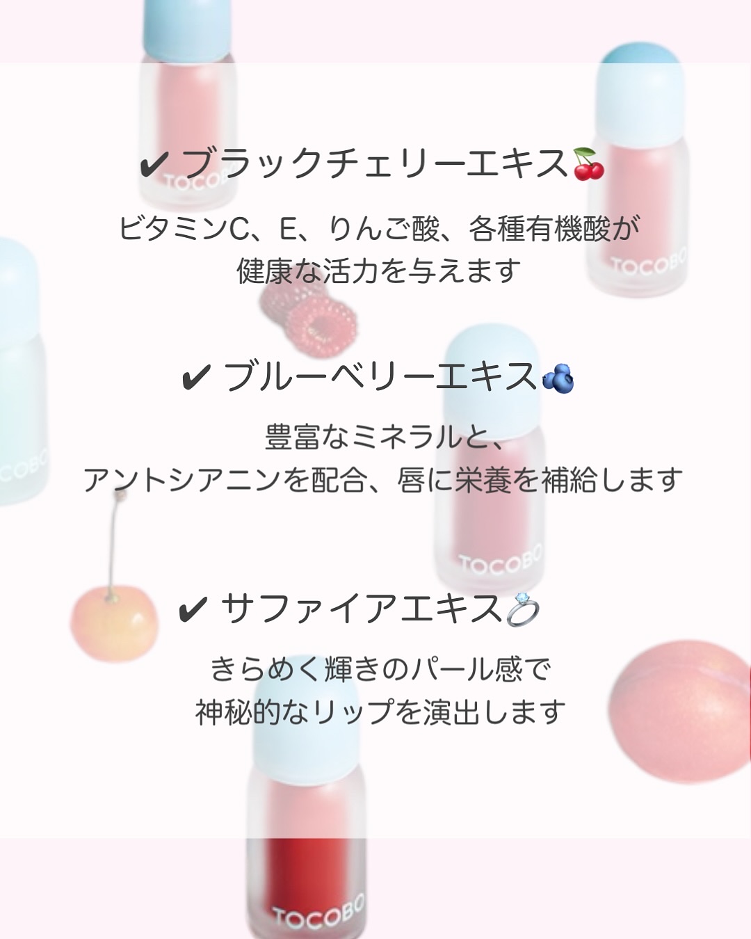 \🍒ベリーをそのまま絞ったように色づくリップオイル🫐/TOCOBOジューシーベリープランピングリップオイルこちらはメーカー様からいただき、お試し致しました。ありがとうございます。めちゃくちゃ可愛いオイルリップ!塗った瞬間からうるちゅるリップに...
