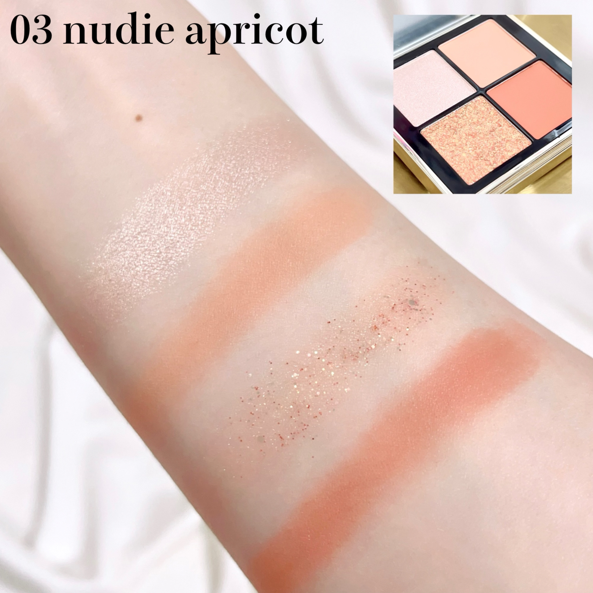 高発色だけどシアーで 粉質も柔らかく肌に密着してくれるアイシャドウ マットカラー2色、ハイライトカラー1色 グリッター1色、の4色パレット 個人的にやっぱり使いやすい04がお気に入り