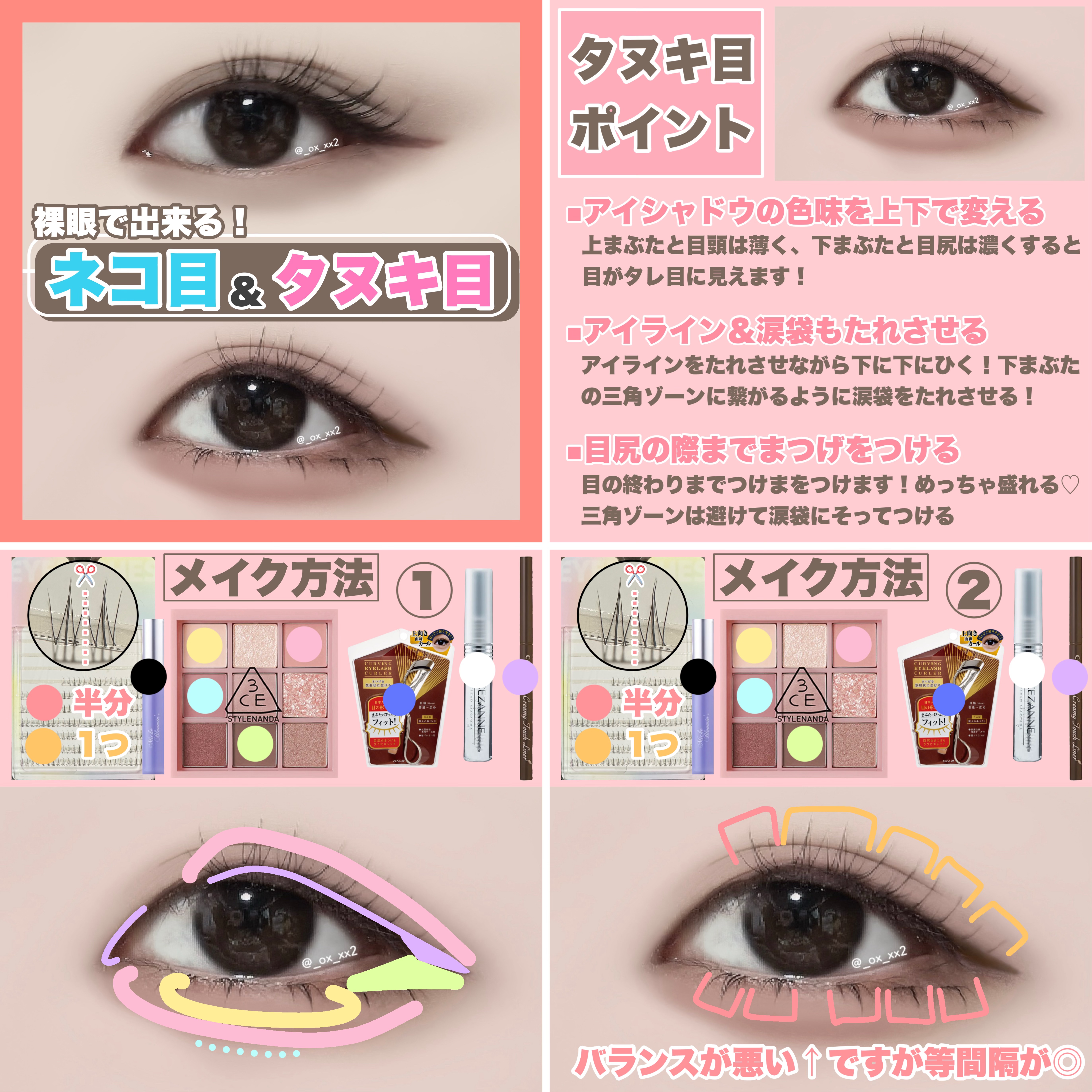 💗ベースカラーを全体にのせる💗 薄めのカラーがオススメです! 🍊二重幅にグラデーションになるようにのせる🍊 目の縦幅を出すためにグラデにします! 🍇アイライナーを長めに引く🍇 上目頭と上目尻に引く、目の横幅を出すためです!