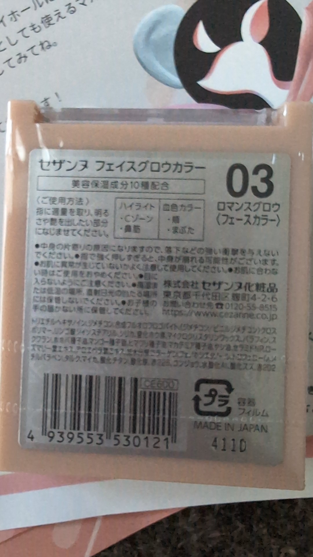 - <01 アプリコットグロウ> トリエチルヘキサノイン、ジメチコン、合成フルオロフロゴパイト、(ジメチコン/ビニルジメチコン)クロスポリマー、リンゴ酸ジイソステアリル、シリカ、窒化ホウ素、マイクロクリスタリンワックス、パラフィン、スクワラン、ホホバ種子油、マンゴー種子脂、ヒマワリ種子油、マカデミア種子油、ヤシ油、セラミドNP、ローズマリー葉エキス、アロエベラ葉エキス、加水分解コラーゲン、フェノキシエタノール、トコフェロール、メチルパラベン、タルク、マイカ、酸化チタン、酸化鉄、赤226、コンジョウ、水酸化Al、酸化スズ <02 ローズグロウ> トリエチルヘキサノイン、ジメチコン、合成フルオロフロゴパイト、(ジメチコン/ビニルジメチコン)クロスポリマー、リンゴ酸ジイソステアリル、シリカ、窒化ホウ素、マイクロクリスタリンワックス、パラフィン、スクワラン、ホホバ種子油、マンゴー種子脂、ヒマワリ種子油、マカデミア種子油、ヤシ油、セラミドNP、ローズマリー葉エキス、アロエベラ葉エキス、加水分解コラーゲン、フェノキシエタノール、トコフェロール、メチルパラベン、タルク、マイカ、酸化チタン、酸化鉄、赤226、コンジョウ、水酸化Al、酸化スズ、赤202 <03 ロマンスグロウ> トリエチルヘキサノイン、ジメチコン、合成フルオロフロゴパイト、(ジメチコン/ビニルジメチコン)クロスポリマー、リンゴ酸ジイソステアリル、シリカ、窒化ホウ素、マイクロクリスタリンワックス、パラフィン、スクワラン、ホホバ種子油、マンゴー種子脂、ヒマワリ種子油、マカデミア種子油、ヤシ油、セラミドNP、ローズマリー葉エキス、アロエベラ葉エキス、加水分解コラーゲン、フェノキシエタノール、トコフェロール、メチルパラベン、タルク、マイカ、酸化チタン、酸化鉄、赤226、コンジョウ、水酸化Al、酸化スズ、赤202 <SP1 ヨザクラグロウ> トリエチルヘキサノイン、ジメチコン、合成フルオロフロゴパイト、(ジメチコン/ビニルジメチコン)クロスポリマー、リンゴ酸ジイソステアリル、シリカ、窒化ホウ素、マイクロクリスタリンワックス、パラフィン、スクワラン、ホホバ種子油、マンゴー種子脂、ヒマワリ種子油、マカデミア種子油、ヤシ油、セラミドNP、ローズマリー葉エキス、アロエベラ葉エキス、加水分解コラーゲン、フェノキシエタノール、トコフェロール、メチルパラベン、タルク、マイカ、酸化チタン、酸化鉄、赤226、赤202、コンジョウ、グンジョウ、水酸化Al、酸化スズ