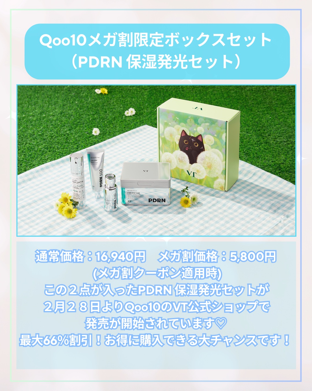 Qoo10メガ割限定ボックスセット(PDRN 保湿発光セット)※ 2月28日に発売 肌に弾力を与え ツヤ感溢れる発光肌になりたいならこれ☝🏻 販売個数1620万個突破! ベスコス常連のVTのシートマスクから話題のPDRN入り登場👏🏻