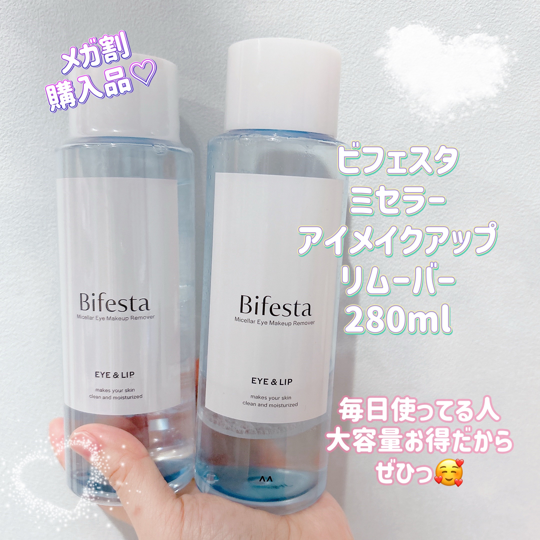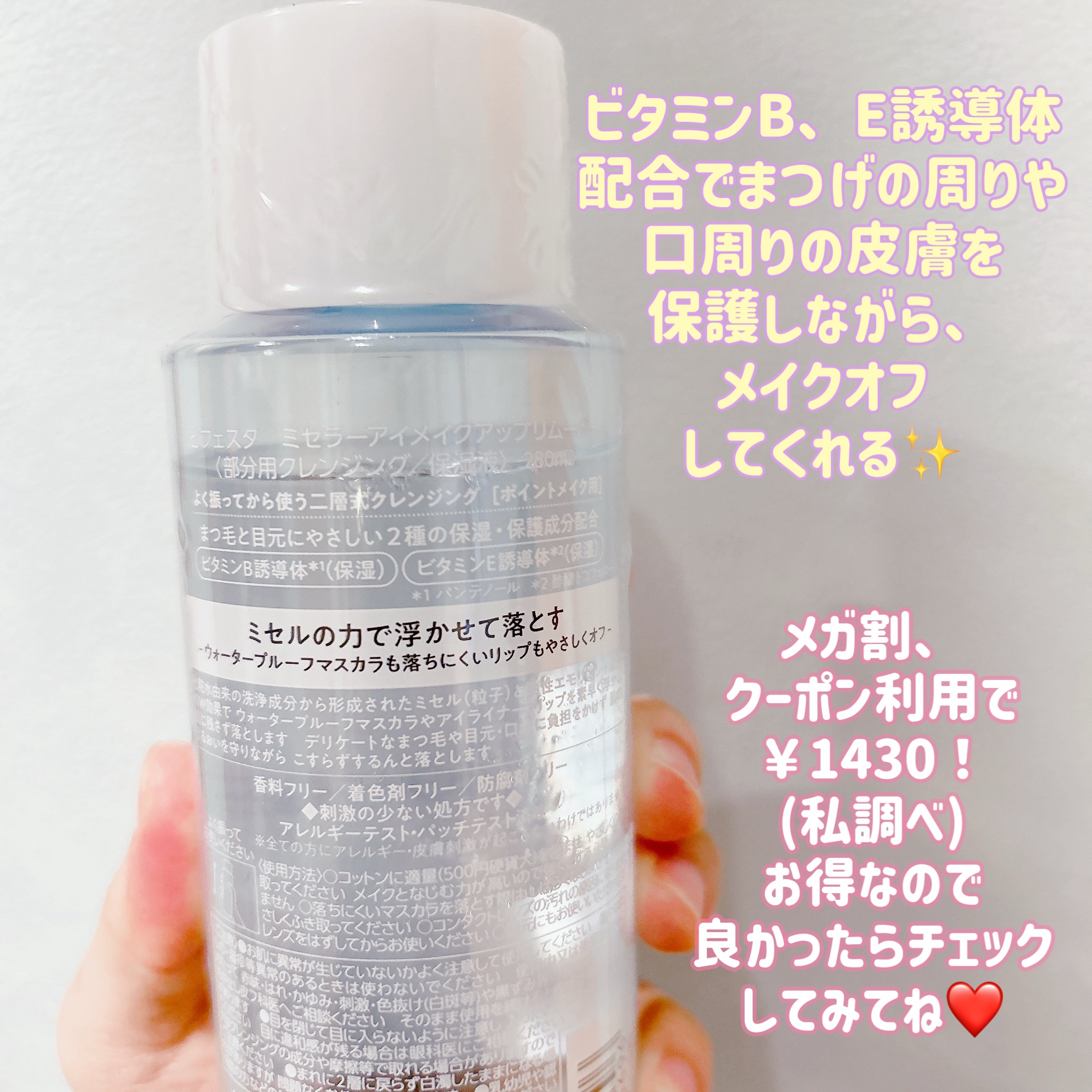 ビフェスタさまのアンケート企画でいただきましたビフェスタミセラーアイメイクアップリムーバー🤍2層式ポイントメイクリムーバー!アイメイクやリップなど部分用のクレンジングです!コットンにつけて拭き取るようにして使います!普段のクレンジングだけだと...