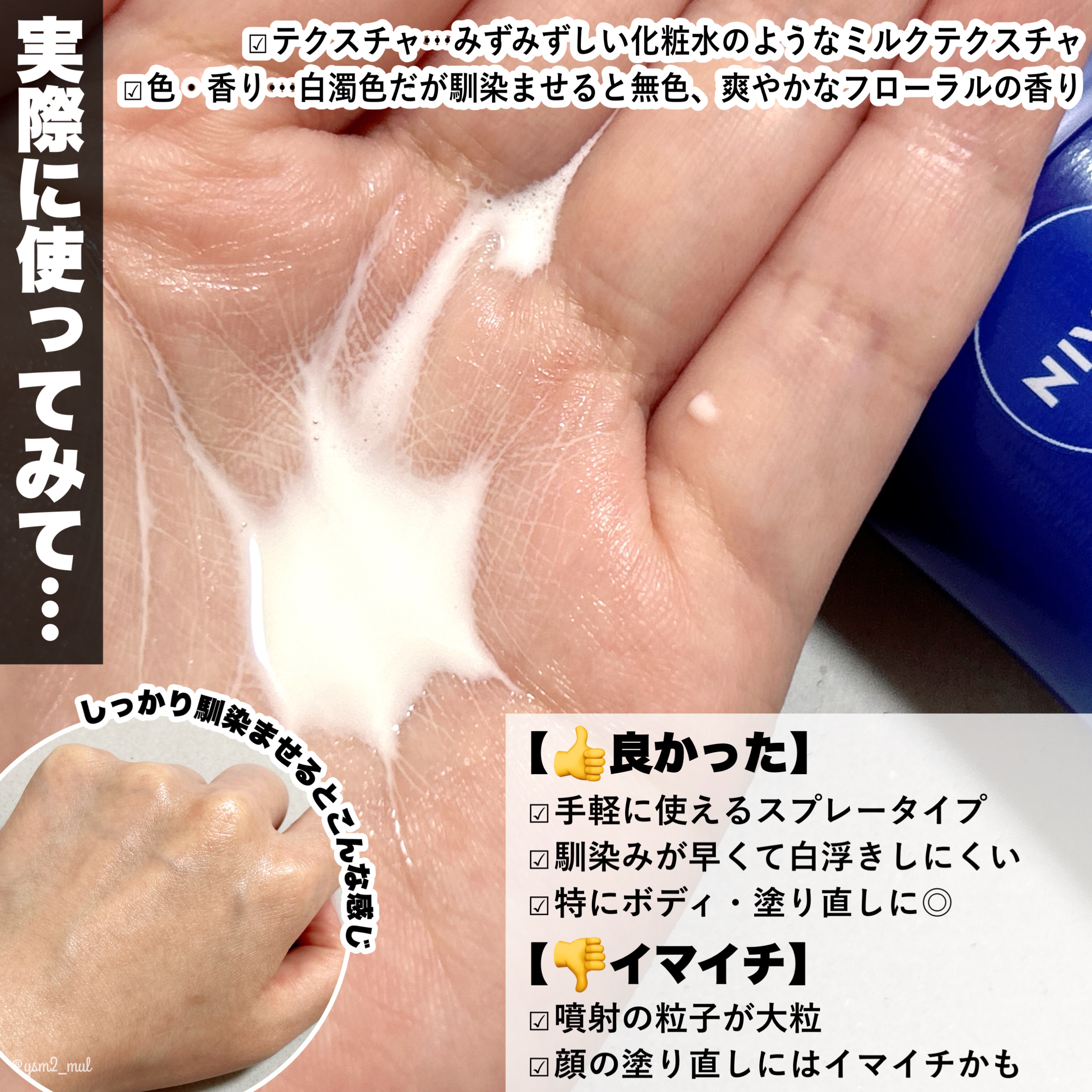 ニベアUV ディーププロテクト&ケアシリーズの『ジェル』がシリーズ初の大型改良⭐︎ 顔からだ、両方に使えます! 馴染みも良くて、塗っていないようなぐらい邪魔にならないので、顔にも使いやすかったで😊🤍 ミストタイプの日焼け止め、初めて使いました🙇♀️ 乳白色のミルクがミスト状で出て来ます。
