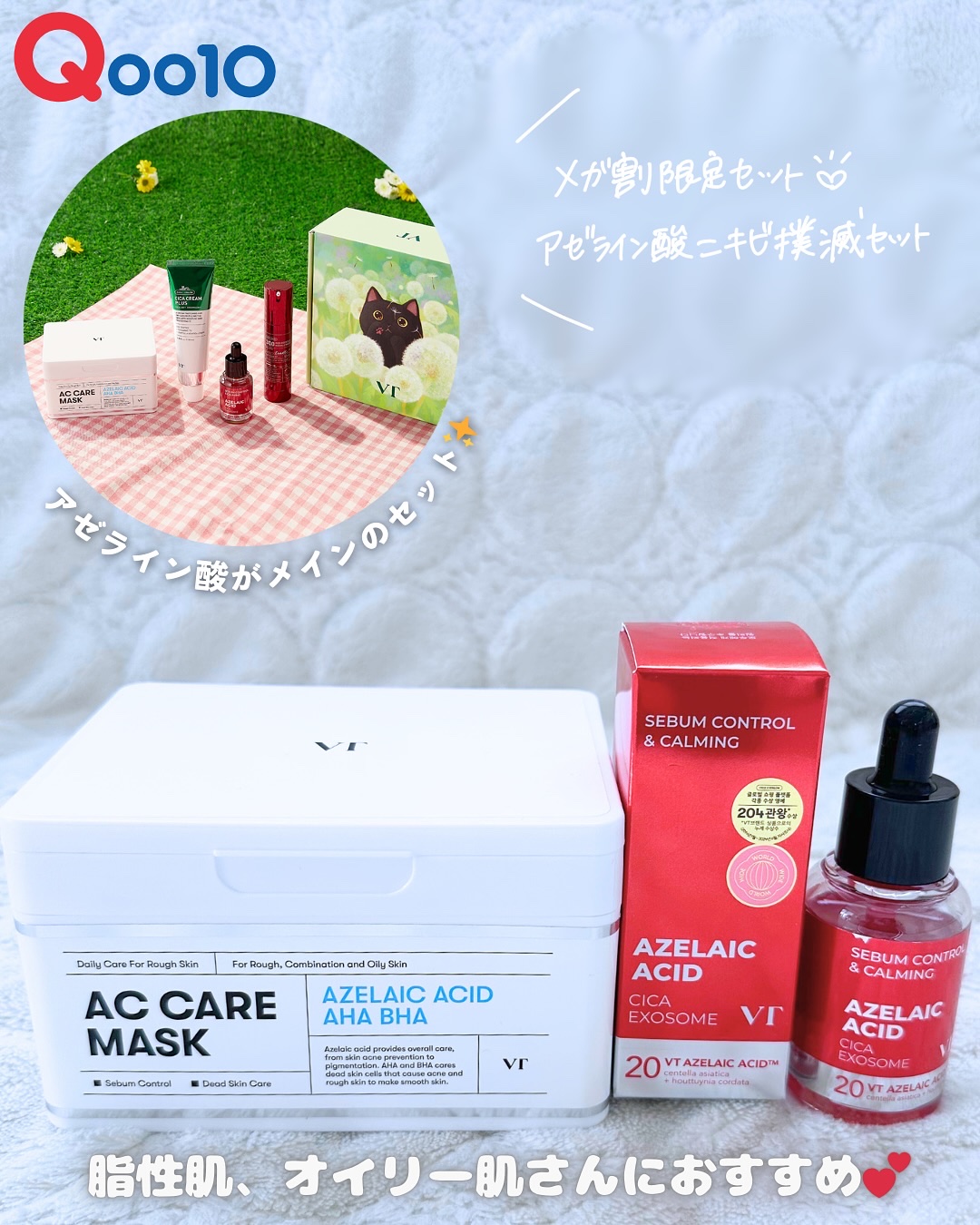 高純度99%アゼライン酸×CICAエクソソーム成分配合❤️💚 油分と皮脂を調節して肌トラブルを集中ケア🫶 販売個数1620万個突破のVTシートマスク🙌 注目のアゼライン酸配合のシートマスクが登場✨ 最大65%割引!! 是非チェックしてみてね〜🕊️