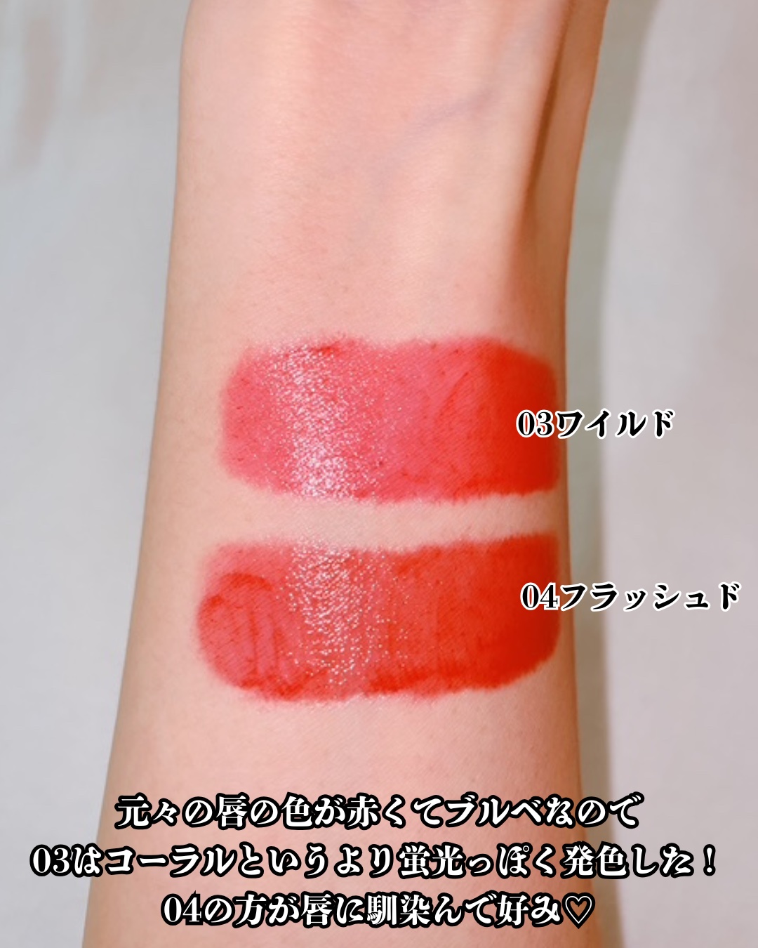 水分をふくんだコンディション成分79%配合でしっとり感をキープするウォータージェル&オイルフォーミュラリッププランパーティント。 03ワイルドは、イエベ春さんにピッタリなブライトコーラル。 わたしがつけると、ピンクコーラルて感じでピンクグレープフルーツカラーに感じた!! 付け心地いいし、色持ちよくてぷるぷる🩵