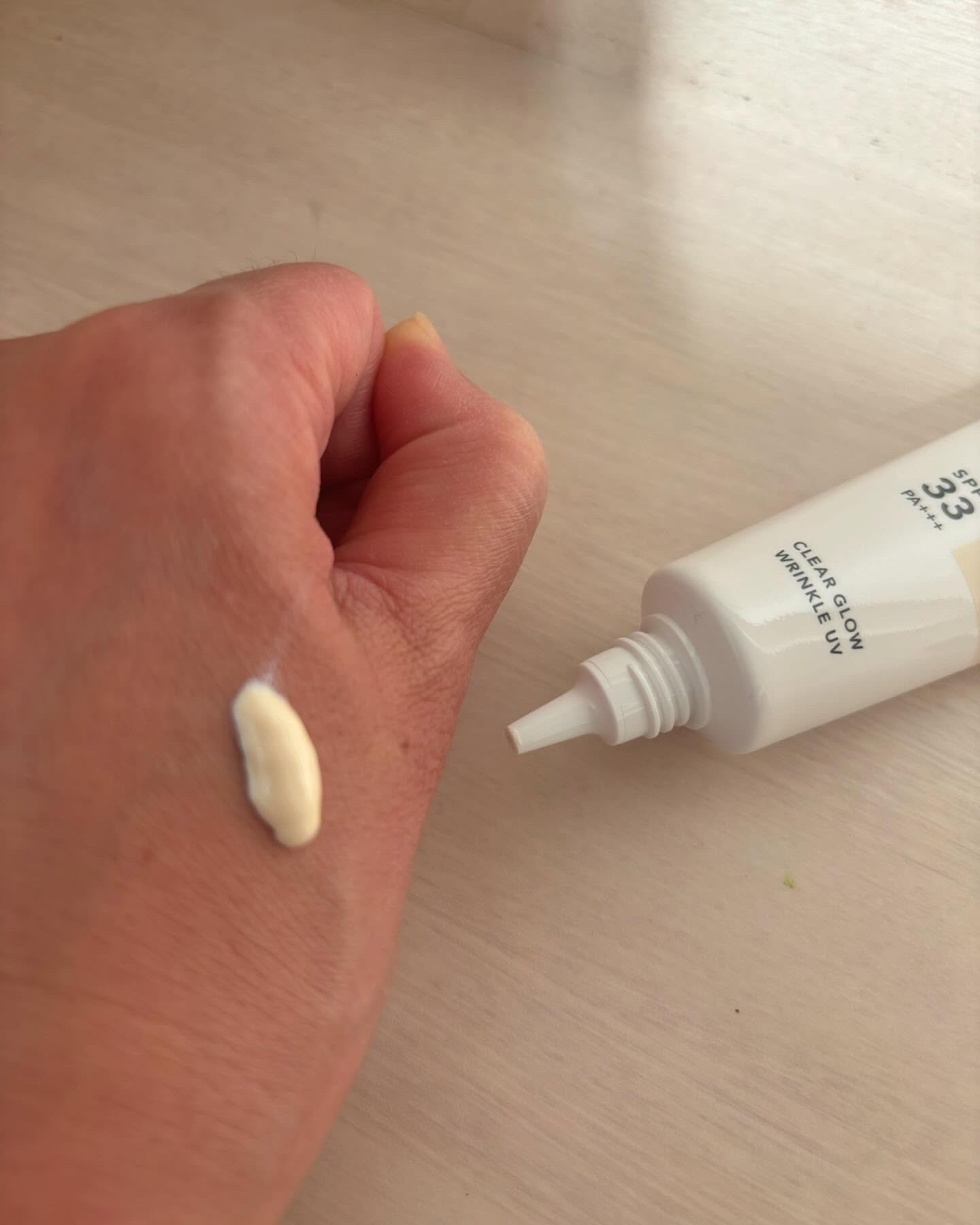 シワ改善もできるUVクリームという特徴なんです! 柔らかいクリーム状で、伸びは良いですが、適度なところで指が止まり密着感があるのも好きです。 素肌がキレイになったみたいに感じるのでお気に入りで、休日はこれだけで過ごしてます✨