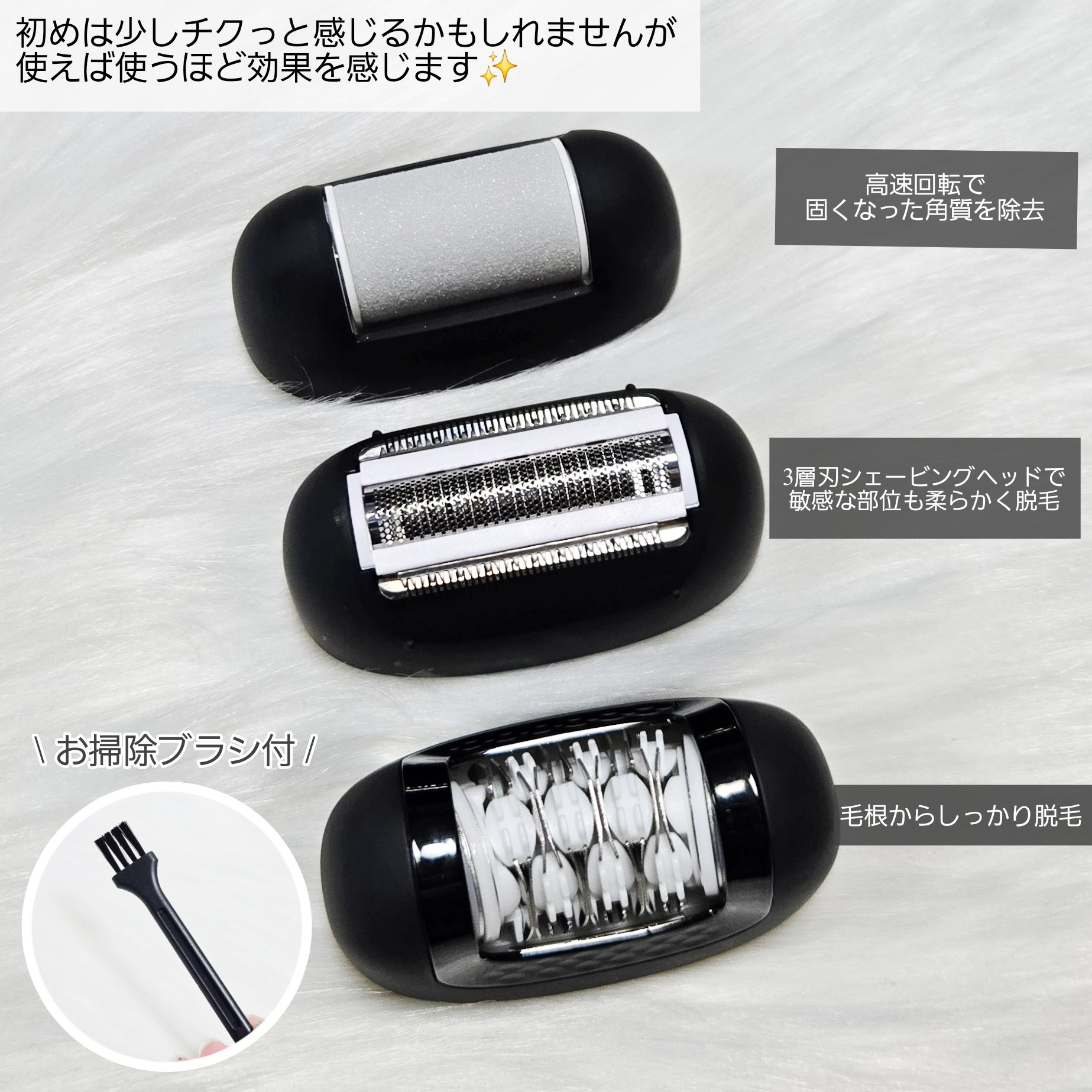 自宅で簡単に毛根除去器を使って脱毛しよう✨ 3種類のヘッドで、毛根の除去、シェービング、角質ケアまでこれ一台😁🤍 初めは少しチクっと感じるかもしれませんが、使うほどに快適に🙆♀️ かかともケアできるのも嬉しい☺️✨ USBケーブルで充電可能だよ🙌 コスパよいね💓
