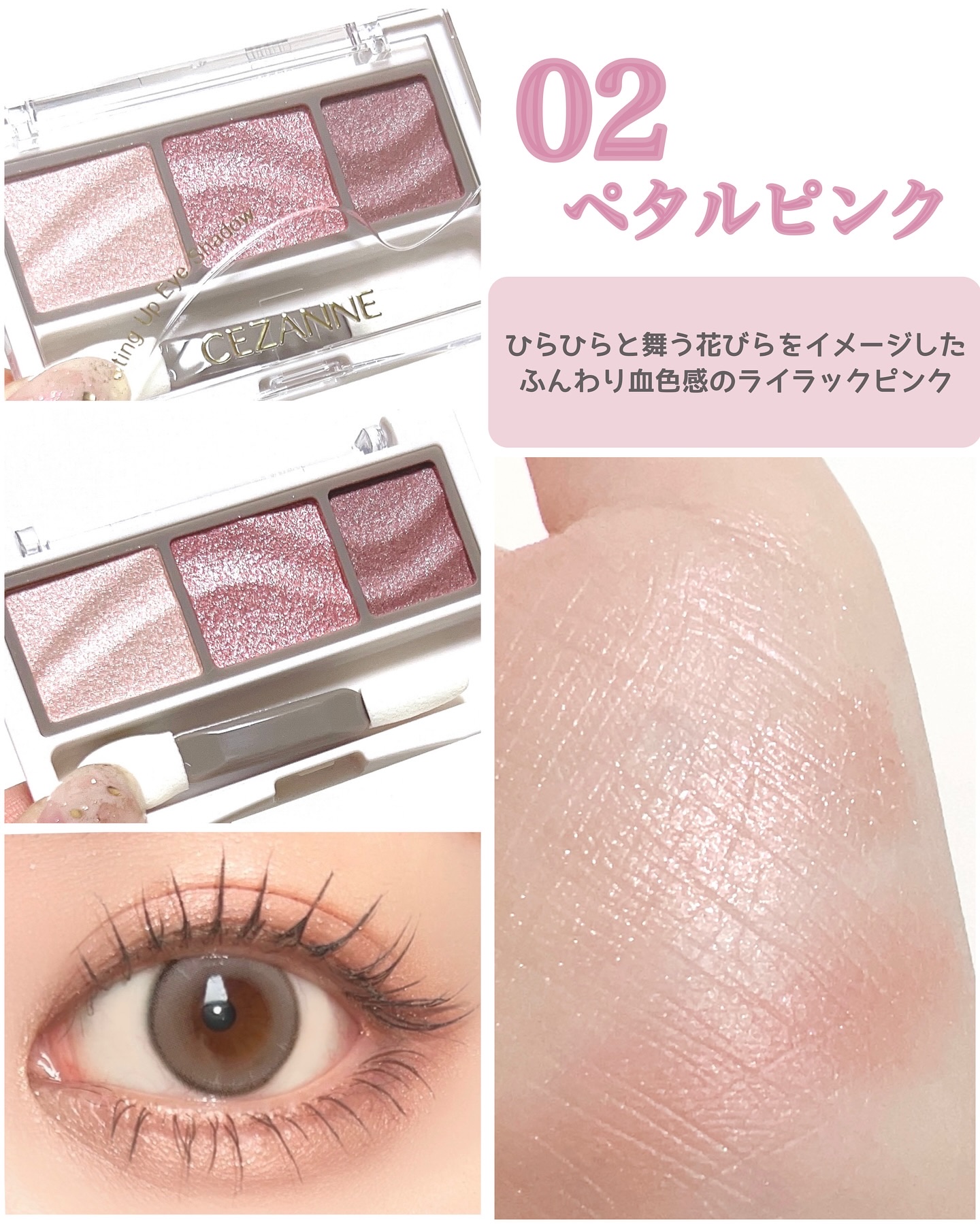 - 簡単に繊細グラデが作れる透けうる3色アイシャドウ。 使い方に迷わない!3色を重ねるだけで作りこんだような繊細グラデーションが完成。うるっと透け感×高発色で自然にくっきりとした目元に。 光を散乱させてくすみを払うソフトフォーカス効果パウダーを高配合。くすみにくく透き通るような明るい仕上がり。 しっとりとしたオイルコーティング処方で、ピタッと密着してヨレにくい。 ダブルエンドチップ付き。 01 ロイヤルベージュ:ベーシックに使いやすいブラウンベージュ。 02 ペタルピンク:ふんわり血色感をまとうライラックピンク。