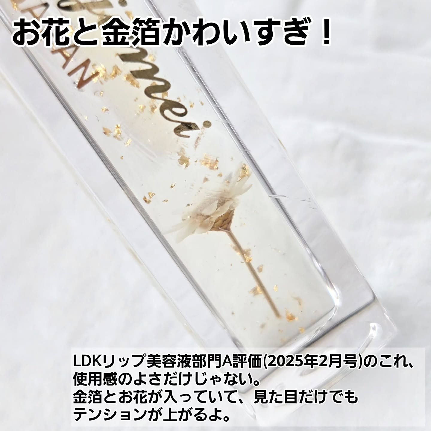 美容保湿成分*を贅沢に配合。唇にうるおいとツヤ*を与えるリップ美容液 金粉とお花を閉じ込めた、ガラス細工のような美しいリップエッセンス。ひとつひとつ手作業で本物のお花を閉じ込めていて、同じアイテムでも個体差がでてくるから贈りものにも喜ばれるやつ😘 テクスチャーはサラッとしていてベタつき感のない軽やかな塗り心地だからクセがなくて苦手な人は少なそう♪