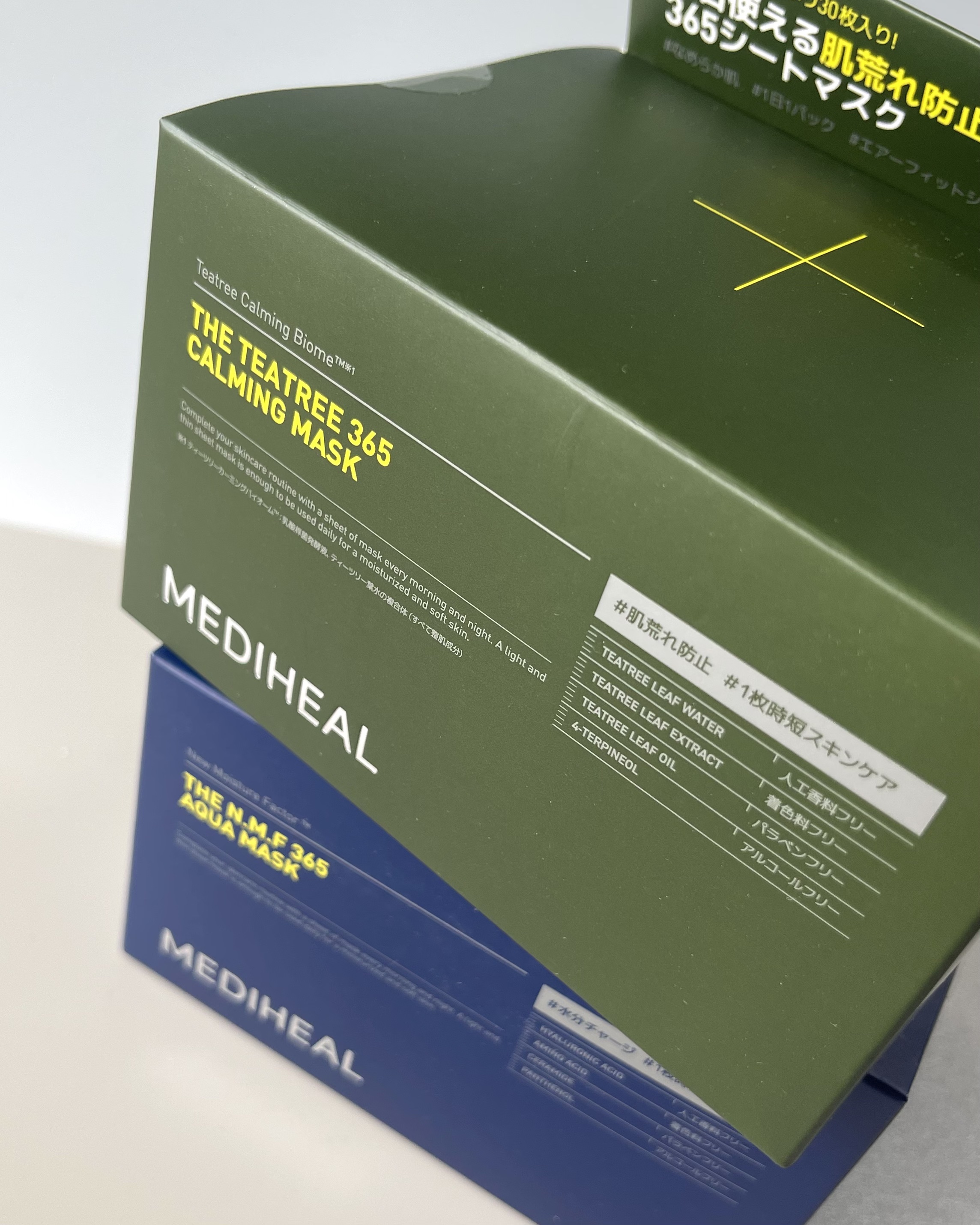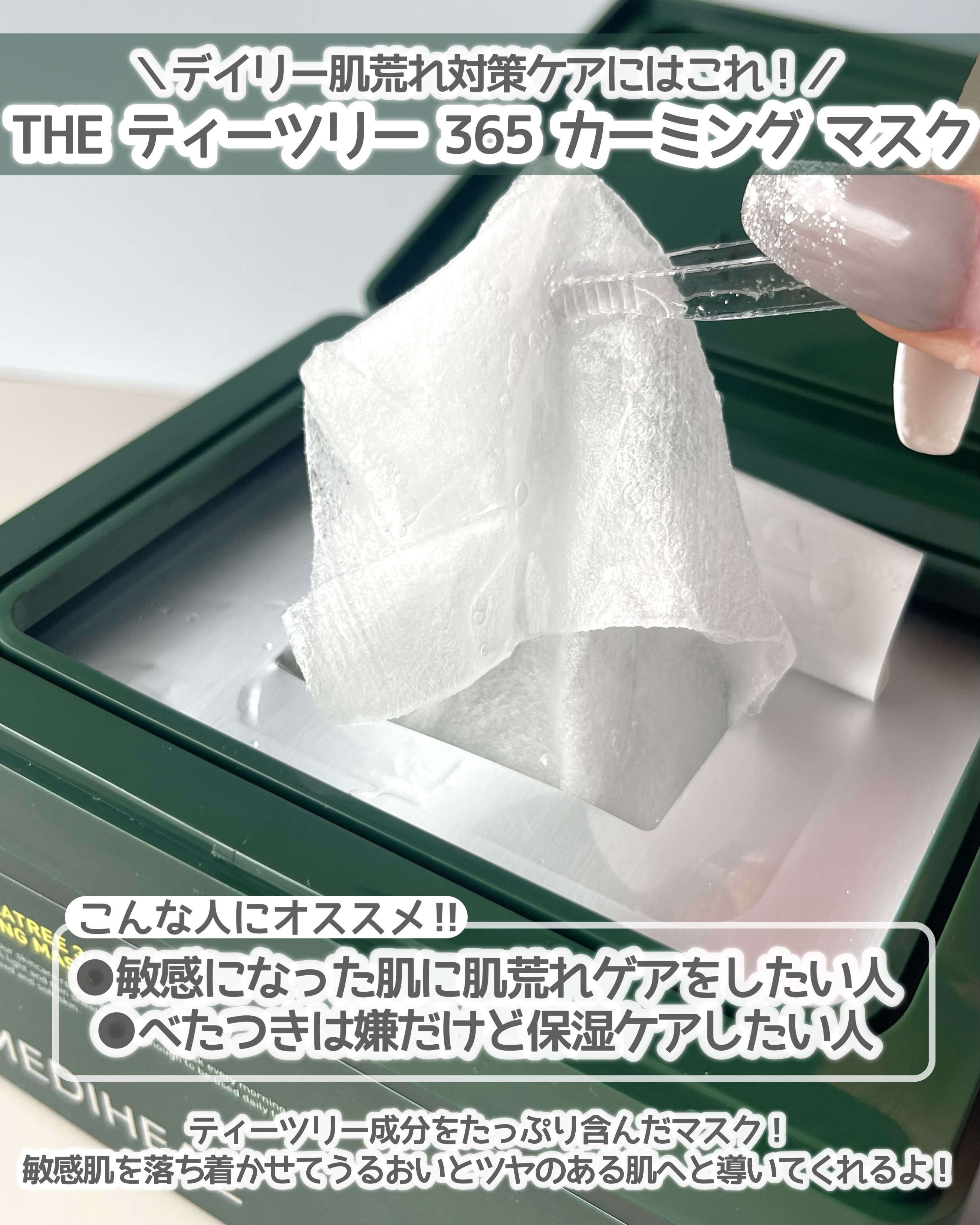 ティーツリー成分がたっぷり含まれているよ💚 敏感肌を落ち着かせて(鎮静)潤いとツヤのある肌へと導いてくれる🤍 メディヒール様独自開発のハイドロディーパーの高保湿エッセンスがたっぷり含まれてるよ🤍 どちらのマスクもヒタヒタのエッセンスでヴィーガン認証のエアーフィットシートを使用!