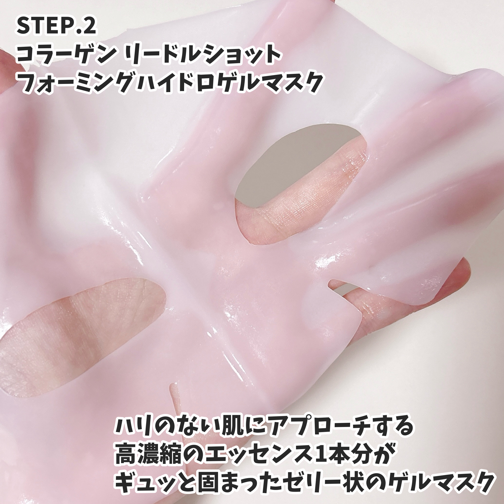 - 簡単2ステップで保湿&ハリ肌をサポートする集中ナイトケア!コラーゲン リードルショット100&フォーミングハイドロゲルマスクで乾燥した肌を潤ってもちもち質感の肌に導く美容保湿成分を肌角層に浸透させます。 エッセンスが1本分ギュッ!と固まったゼリー状になったゲルマスクは毎日変わる肌コンディションに合わせて使用時間を調節しながらケアできます! ■このような方へおすすめ もちもち質感のハリ肌を目指す方 スキンケアの美容保湿成分を角質層まで浸透させたい方 おうちでエステ並の本格ケアを行いたい方