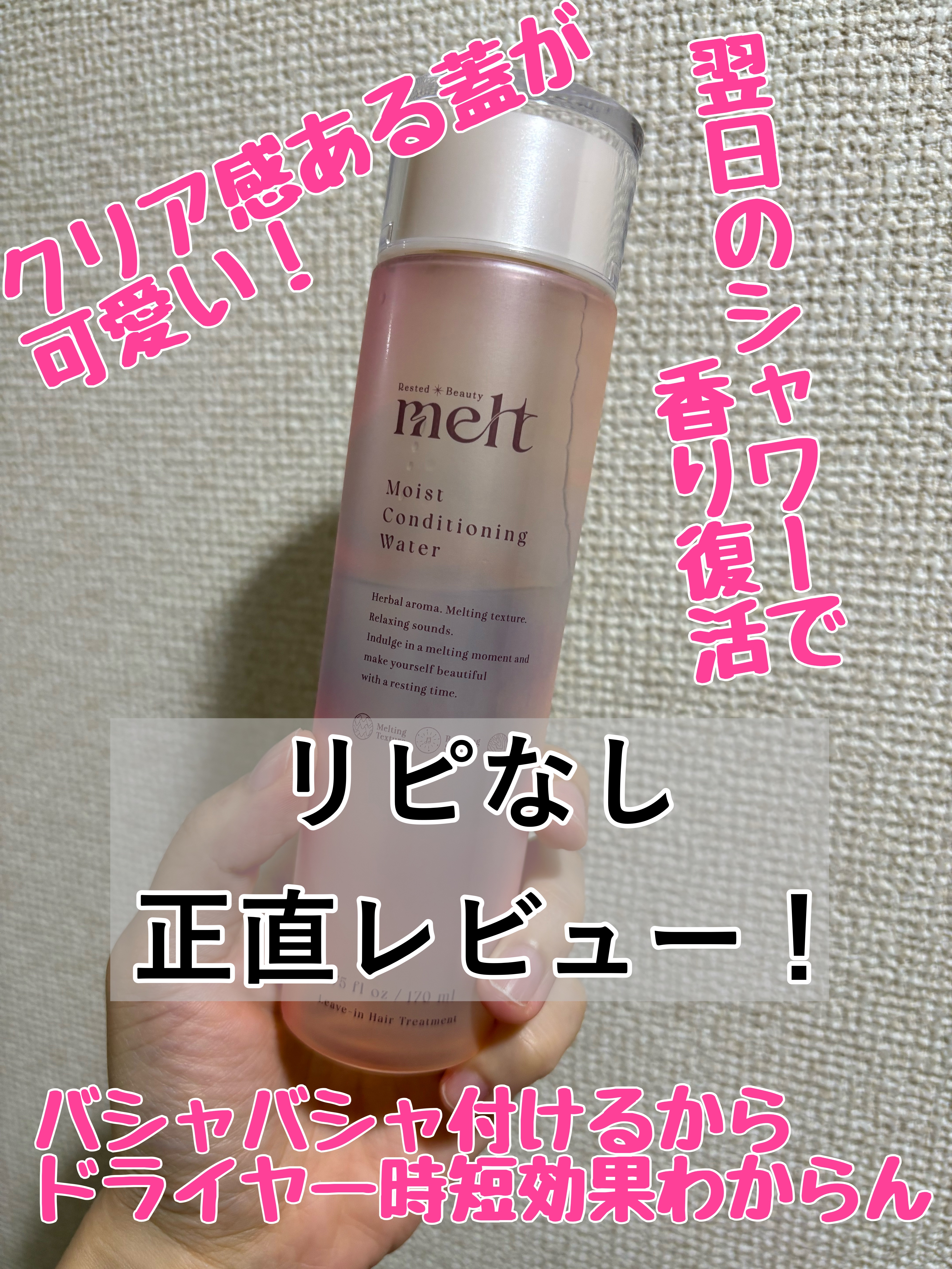 meltメルトモイストコンディショニングウォーターサラッとしたテクスチャで、一瞬アルコールの香りが強いかな?と感じるけど、その後良い香りで包まれます💐自分は寝る前に髪につけてます。ボトルも可愛くてお気に入りです!#ツヤ髪#ウォータートリートメ...