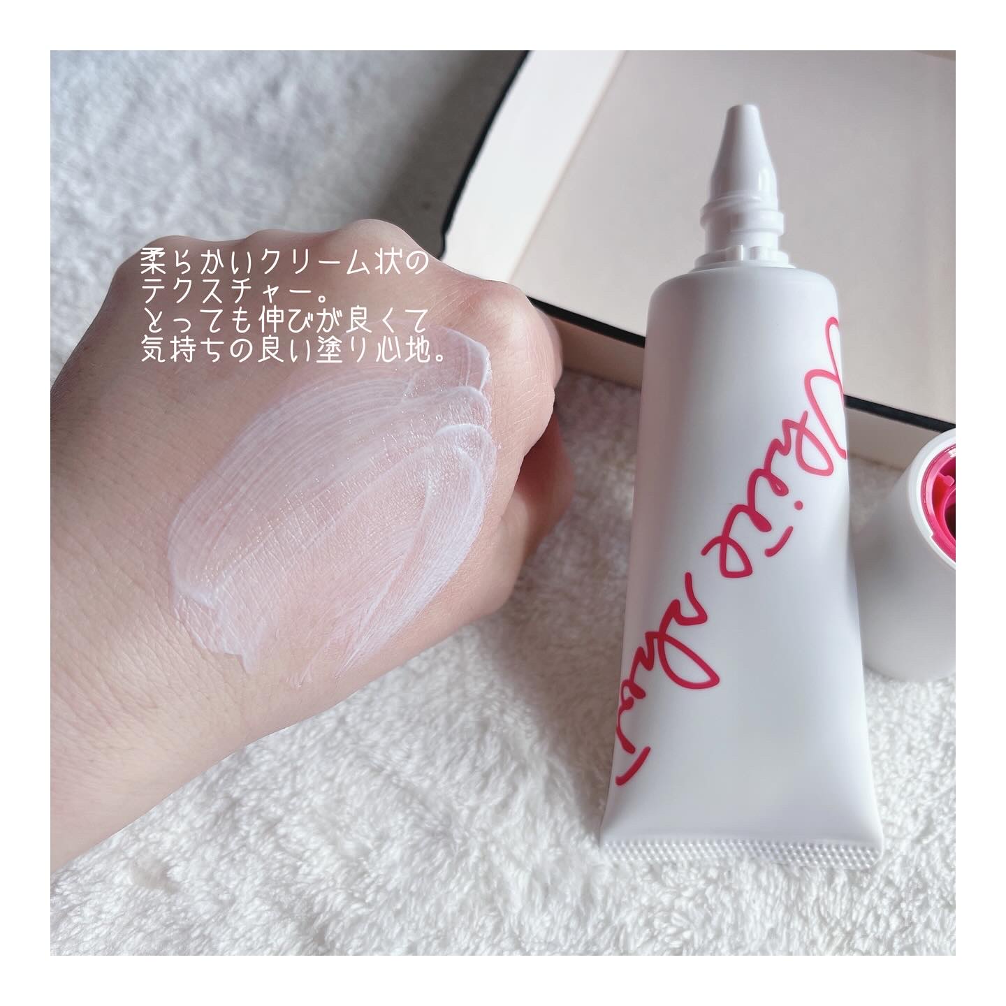 優しいオフホワイトのパッケージが見てるだけで嬉しい気持ちに。 中の化粧液は、ほんのーりトロミがあって柔らかいテクスチャー。 効果的な使い方は、1度顔全体に伸ばしたあと、さらに重ね付けすることなんだそう。