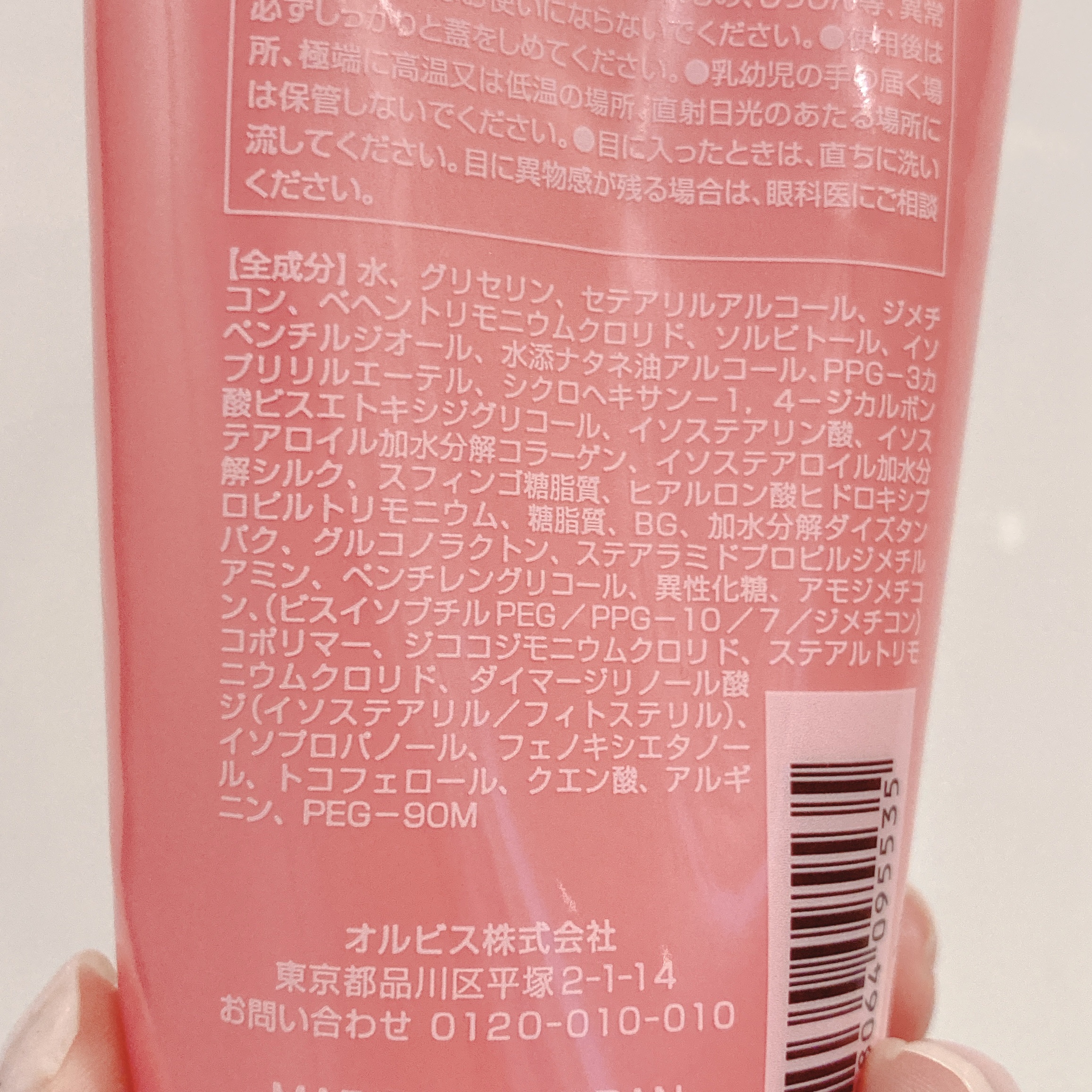 - <200g> 水、ペンチレングリコール、BG、グリセリン、ジメチコン、ソルビトール、フェノキシエタノール、トコフェロール、アルギニン、セテアリルアルコール、クエン酸、イソペンチルジオール、イソプロパノール、イソステアリン酸、ベヘントリモニウムクロリド、ヒアルロン酸ヒドロキシプロピルトリモニウム、PEG-90M、異性化糖、ダイマージリノール酸ジ(イソステアリル/フィトステリル)、水添ナタネ油アルコール、加水分解ダイズタンパク、糖脂質、ステアラミドプロピルジメチルアミン、シクロヘキサン-1,4-ジカルボン酸ビスエトキシジグリコール、ジココジモニウムクロリド、ステアルトリモニウムクロリド、スフィンゴ糖脂質、グルコノラクトン、イソステアロイル加水分解コラーゲン、アモジメチコン、イソステアロイル加水分解シルク、PPG-3カプリリルエーテル、(ビスイソブチルPEG/PPG-10/7/ジメチコン)コポリマー <限定ボトル 200g(ポムポムプリン)> 水、グリセリン、セテアリルアルコール、ジメチコン、ベヘントリモニウムクロリド、ソルビトール、イソペンチルジオール、水添ナタネ油アルコール、PPG-3カプリリルエーテル、シクロヘキサン-1,4-ジカルボン酸ビスエトキシジグリコール、イソステアリン酸、イソステアロイル加水分解コラーゲン、イソステアロイル加水分解シルク、スフィンゴ糖脂質、ヒアルロン酸ヒドロキシプロピルトリモニウム、糖脂質、BG、加水分解ダイズタンパク、グルコノラクトン、ステアラミドプロピルジメチルアミン、ペンチレングリコール、異性化糖、アモジメチコン、(ビスイソブチルPEG/PPG-10/7/ジメチコン)コポリマー、ジココジモニウムクロリド、ステアルトリモニウムクロリド、ダイマージリノール酸ジ(イソステアリル/フィトステリル)、イソプロパノール、フェノキシエタノール、トコフェロール、クエン酸、アルギニン、PEG-90M