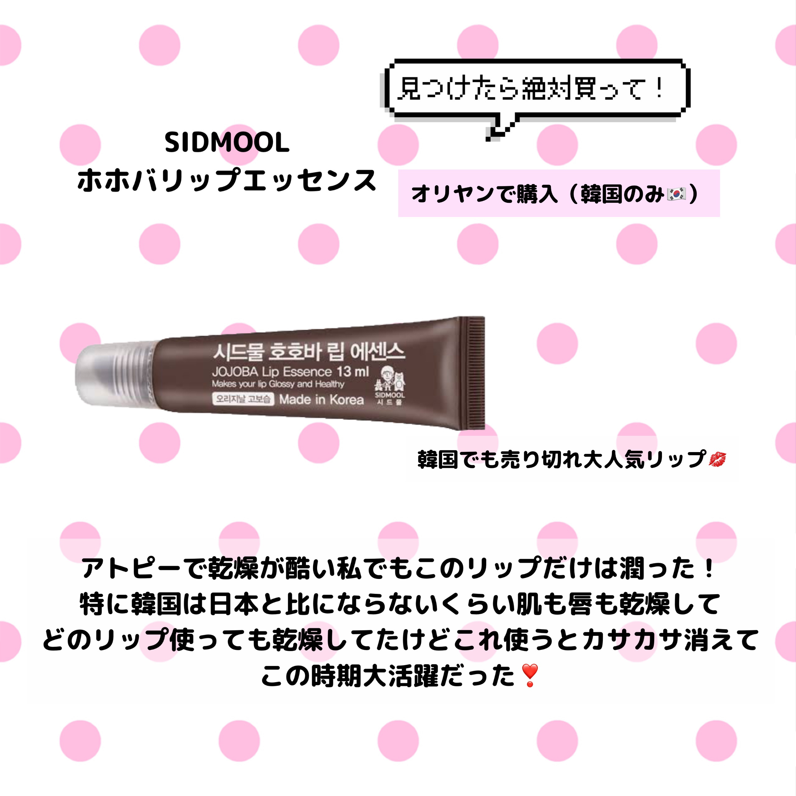⭐️SIDMOOLホホバリップエッセンス韓国行ったら買うべきおすすめの保湿リップクリーム💄これ、コスパ最強なのに唇の縦皺がなくなり、ぷるぷるになるの!さらに、大容量なので、1本買えばなかなか無くなりません!これはお土産だと喜ばれること間違いな...