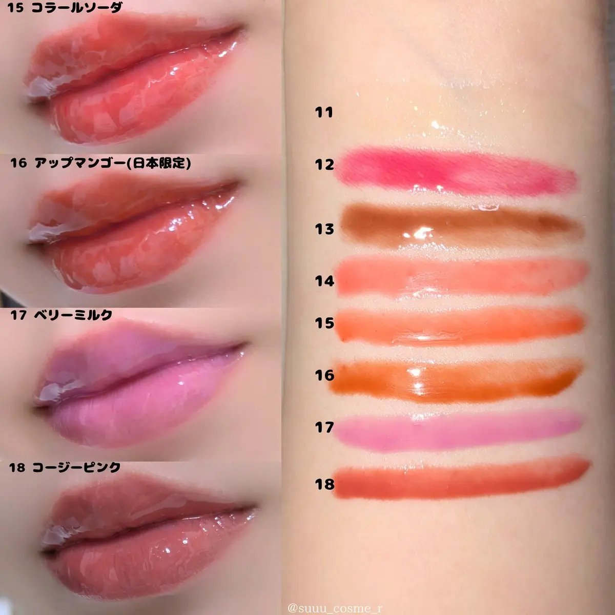 ほんまにほんまに可愛い💖 ピンク好きにはたまらん〜🩷🩷🩷 特に上の2色はラメのきらめきがやばい✨✨ 真ん中のラメは発色も良くて苺っぽいカラー🍓 自然なツヤが出て、ほんのりキラキラするのがほんとに可愛い!!ほんのりピンク味のあるベージュで誰でも使いやすい色味だと思いました✨✨