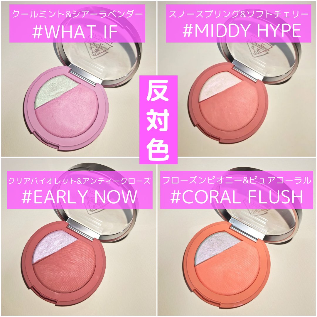 ぜーんぶ盛れる◎めっちゃ可愛い! 色相環を元に計算し尽くした、チークとハイライトの色の組み合わせで簡単にトレンド感のあるメイクができちゃいます🫶🏻 華やかメイクがしたい時は、反対色で盛れツヤほっぺ“コントラストカラー”を選ぶのがおすすめ 【#WHAT IF/#MIDDY HYPE/#CORAL FLUSH/#EARLY NOW】 ナチュラルでこなれ感メイクをしたい時、メイク初心者さんは隣接色でじんわりナチュほっぺ“グラデーションカラー”がおすすめ 【#LAZY TALK/#BEIGE HOUR/#SLICK】