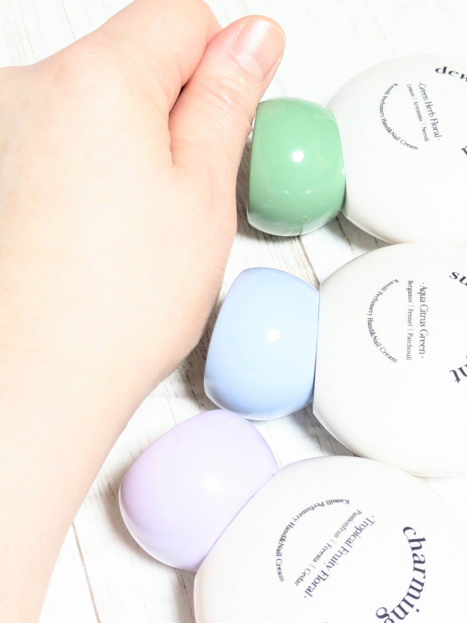 コロンとしたまあるいデザインがかわいい⛄️ ・6種類の植物性オイル配合で肌の鎮静と保湿 全6種類で香りが絶妙に違くてどれもふわっと良い香り しっかり保湿されるのにベタつかないところも◎ ハンドクリームはキャップの部分を下にすると自立するので、お部屋に飾ってもかわいい 人目を引くデザインが持ち運びのテンションも上げてくれる🫶