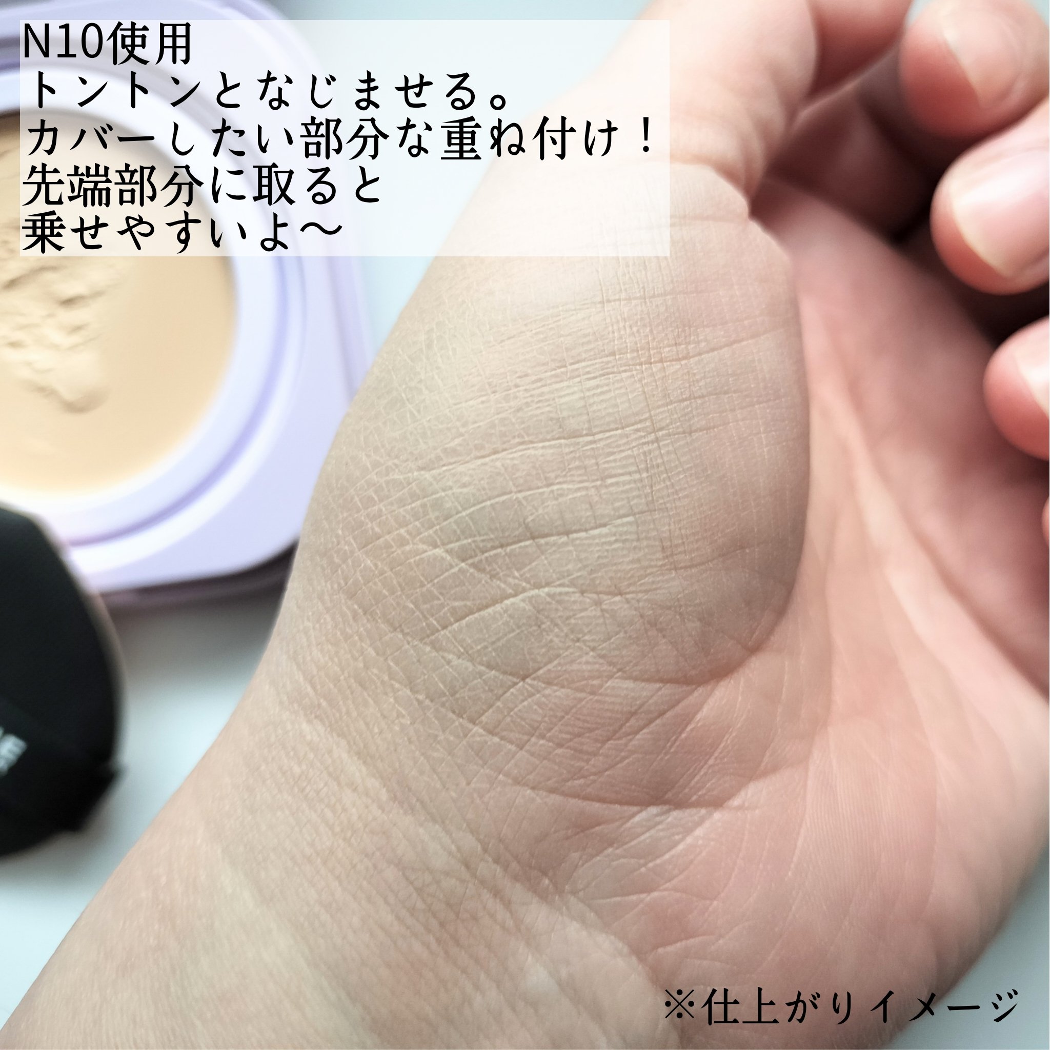 こちらはUVケアも◎ セッティングも簡単に装着できます😁 このブラック色したシンプルデザインの容器も素敵ですよね♡ パフにトントン馴染ませて肌にのせて みると少ししか取っていないのに、つきがよいですね。みずみずしいテクスチャです。 トントンなじませて伸ばしていくと 厚塗り感を感じさせない使用感です。 パフには、ほんの少しつけて内側から外にかけてポンポンと伸ばしていくのが ポイント。 つい、クッションファンデはたっぷりに なっちゃうけどほんの少しで良い◎ そうするとむらなく均一に肌にのせる ことができるね🥺