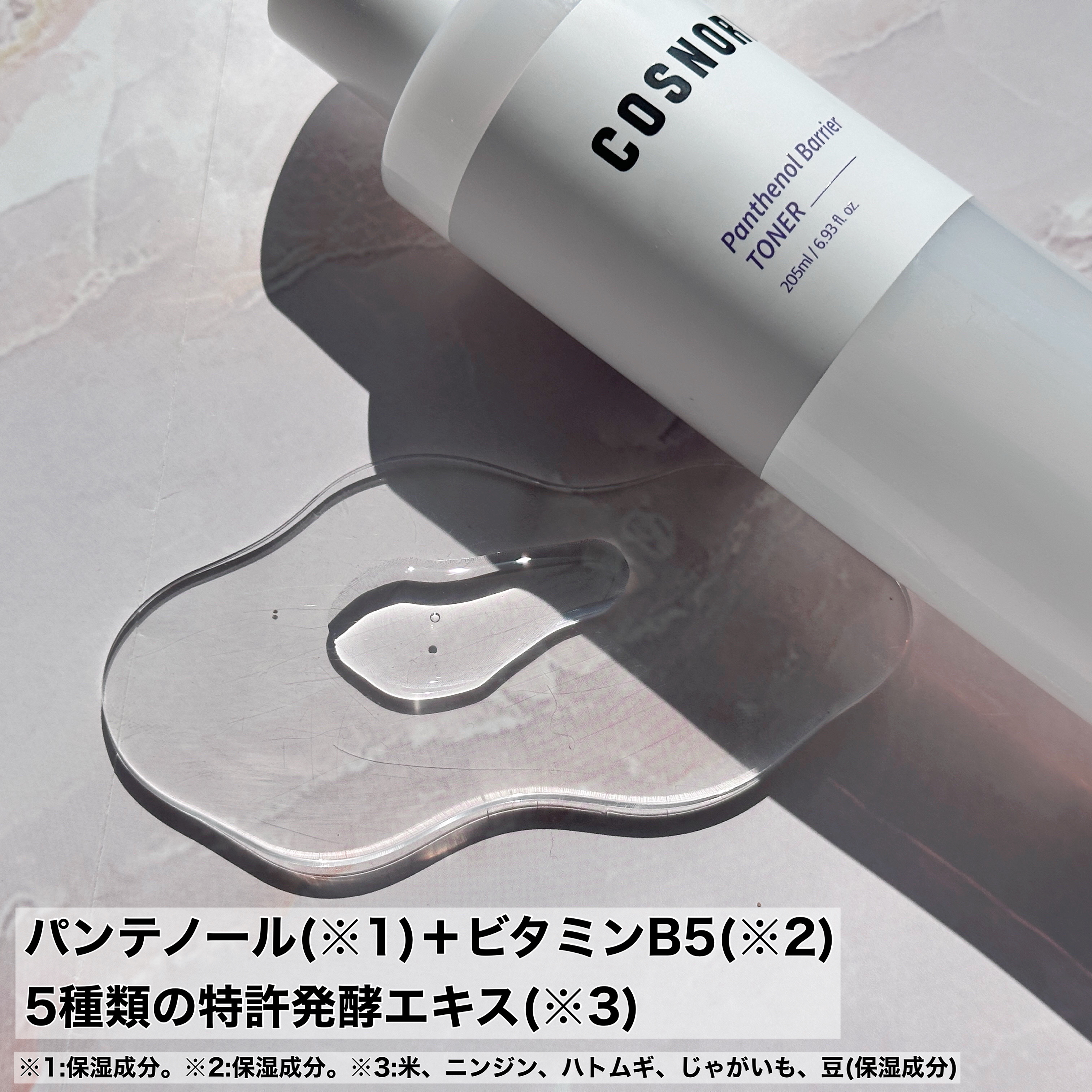 COSNORI・パンテノールバリアトナー栄養素たっぷりの米、人参、ハトムギ、じゃがいも、豆を2段階の発酵過程を通じて低分子化させてより強化された皮膚の吸収力と栄養感で肌のトーンアップ、保湿効果を与えてくれるよトナーはかなりサラッとしたテクスチ...