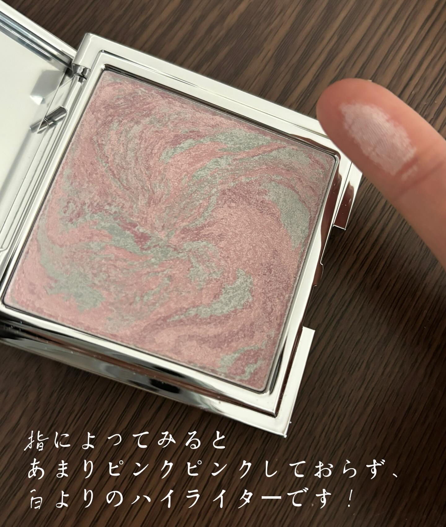 3つのカラーのマーブルブレンディングにより、より多彩で立体的な肌を演出✨ 微細なパールなので馴染み良かったです。ピローピンクはヌーディーピンクのシマーカラーで、ふんわりピンクが煌めく🩷 粉飛びなく密着してくれるのも◎