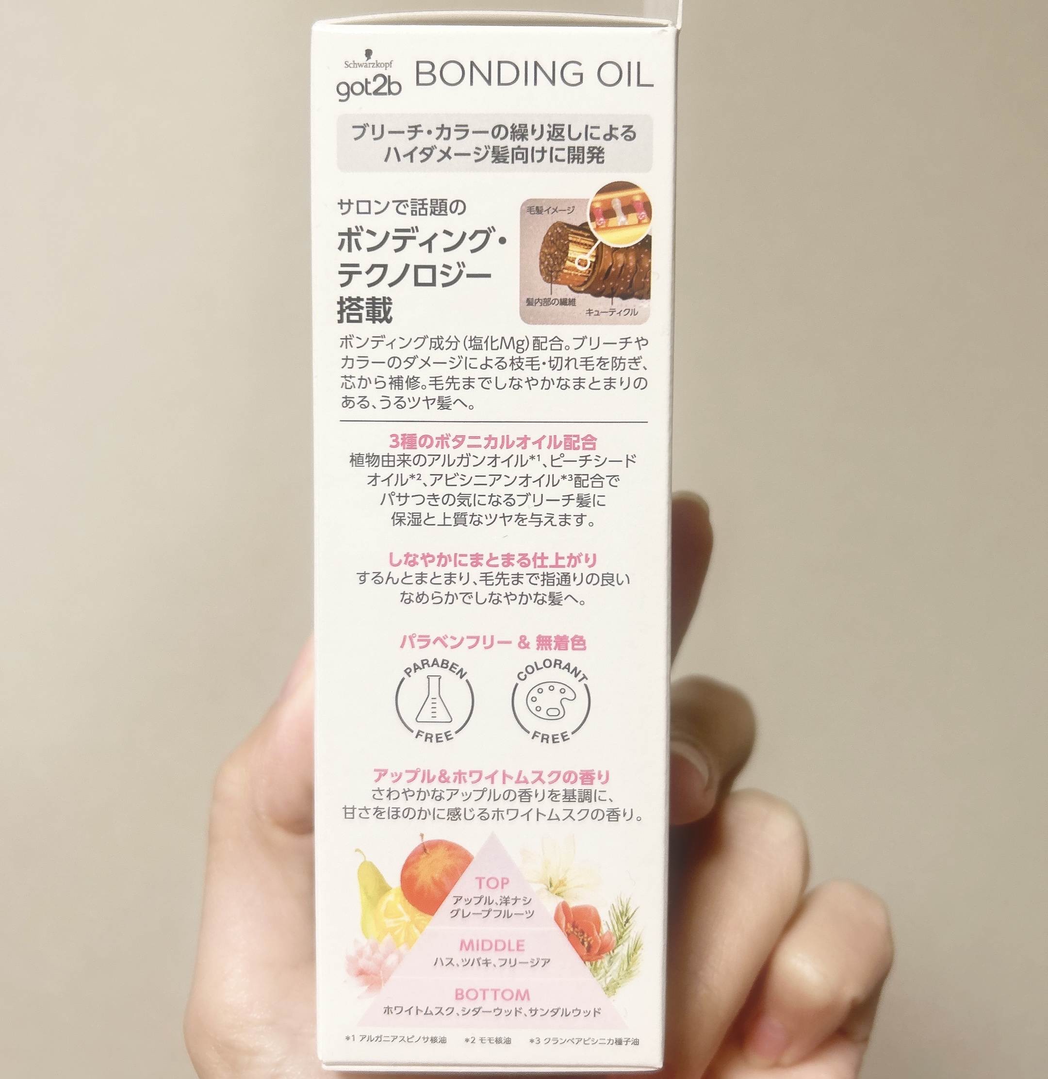 - サロン級の集中補修!ハイダメージ髪用ヘアオイル ブリーチやカラーを繰り返したハイダメージ髪向けに開発 〇サロン発のボンディング・テクノロジーを搭載。芯から補修・髪を保護し、毛先までうるとぅる髪へ 〇3種類のボタニカルオイル(植物由来のアルガンオイル*¹、ピーチシードオイル*²、アピニシアンオイル*³)配合。パサつきの気になるダメージ髪に保湿と上質なツヤを与えます 〇パラベンフリー&無着色 〇アップル&ホワイトムスクの香り *¹アルガニアスピノサ核油 (保湿) *²モモ核油(保湿) *³クランベアビシニカ種子油(保湿)